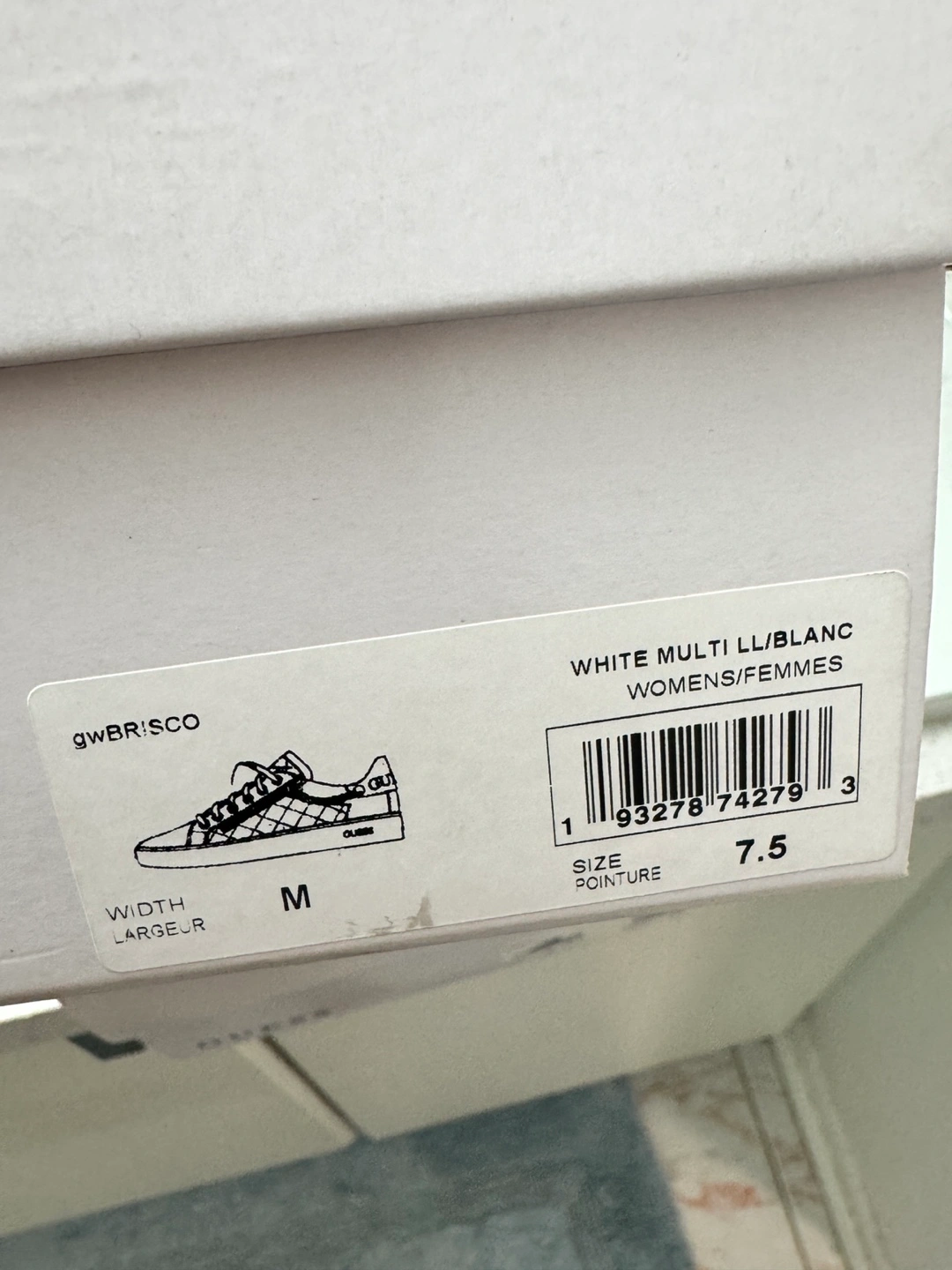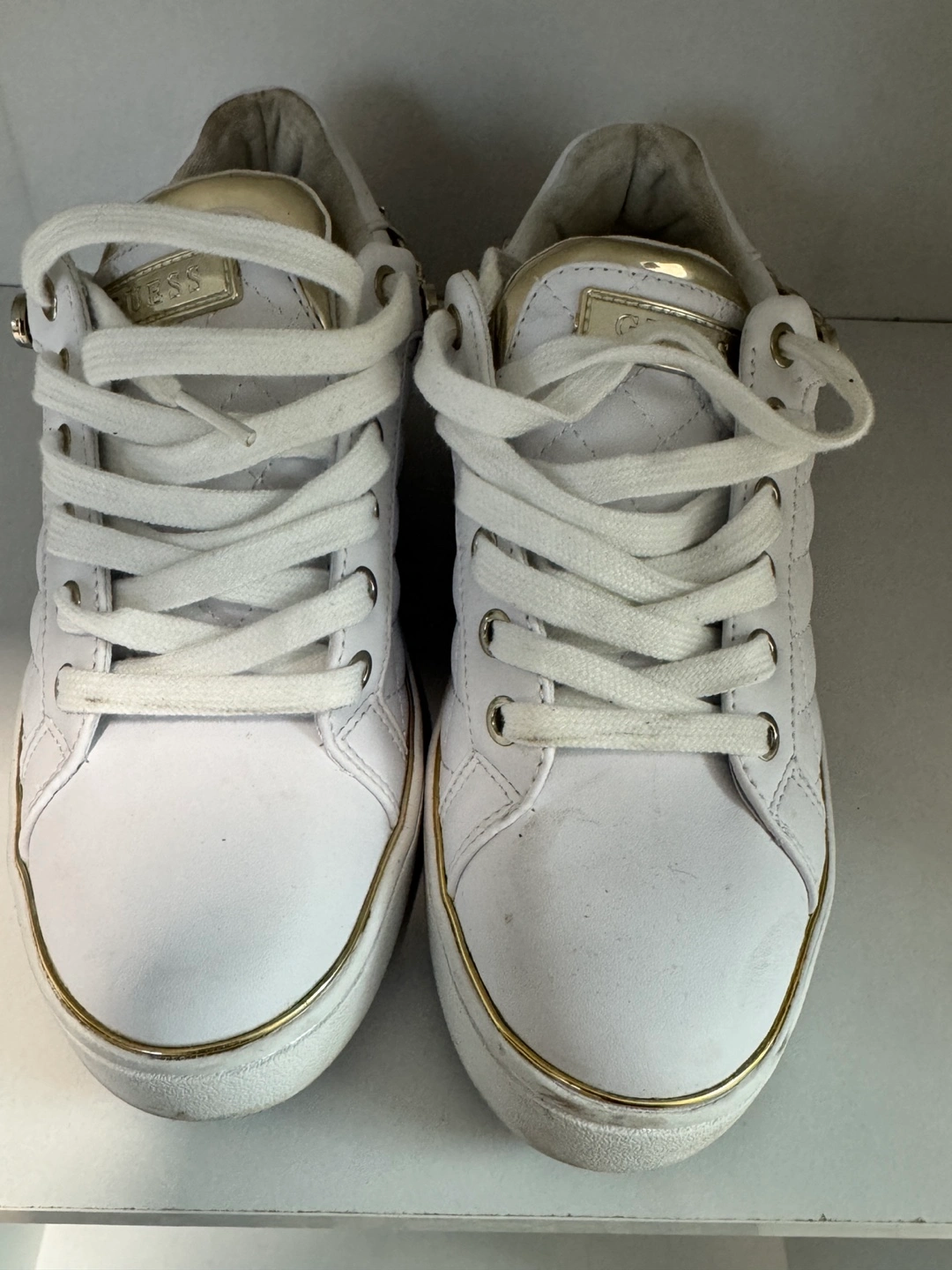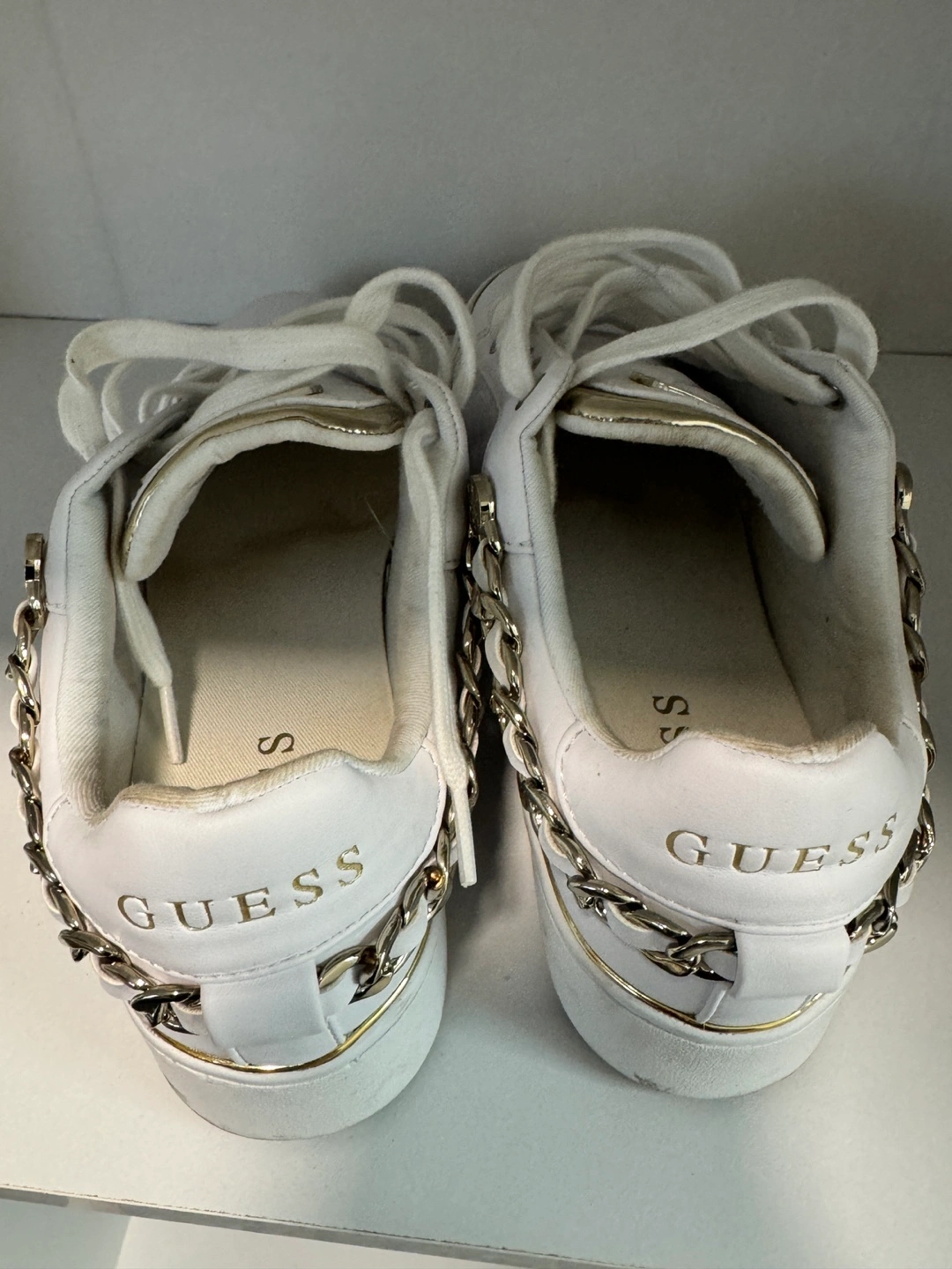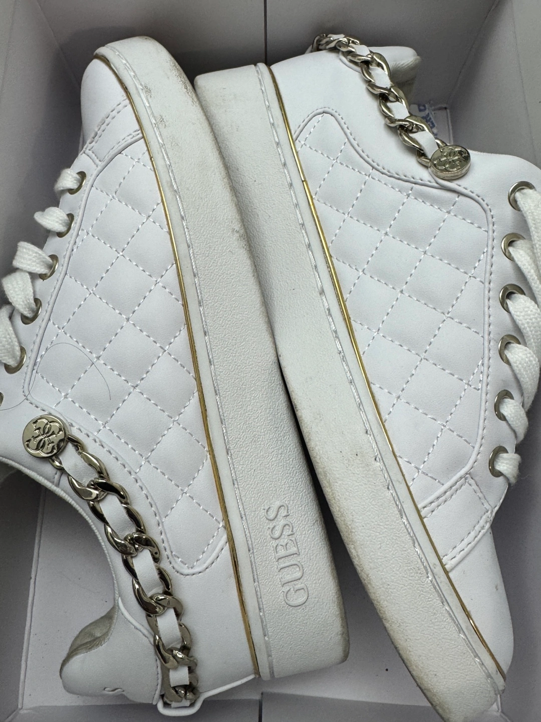 Gentle used. Selling as is. Women's Guess sneakers. White quilted leather. Gold chain detail. Size 7.5.