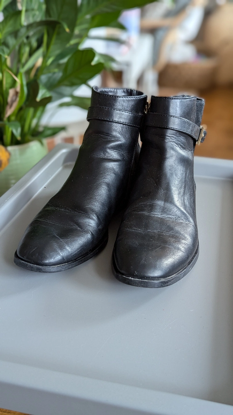Pair of black, faux leather ankle boots. Buckle detail. Low heel. Good used condition. pickup only.