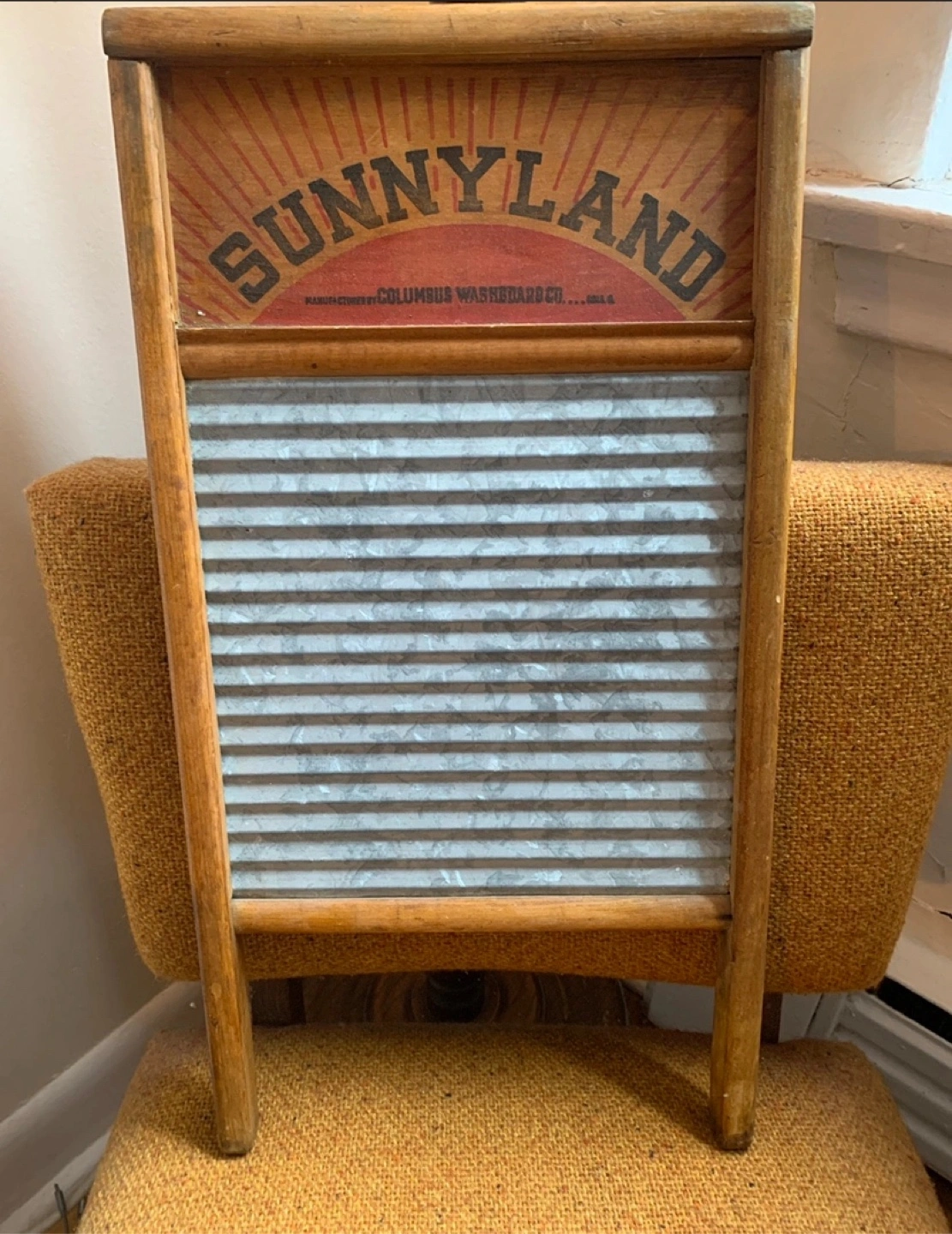 Antique washboard. Wooden frame. Galvanized metal wash surface. Standard family size. Manufactured by Columbus Washboard Co. Unique Sunnyland design. Great for display or vintage laundry enthusiasts.