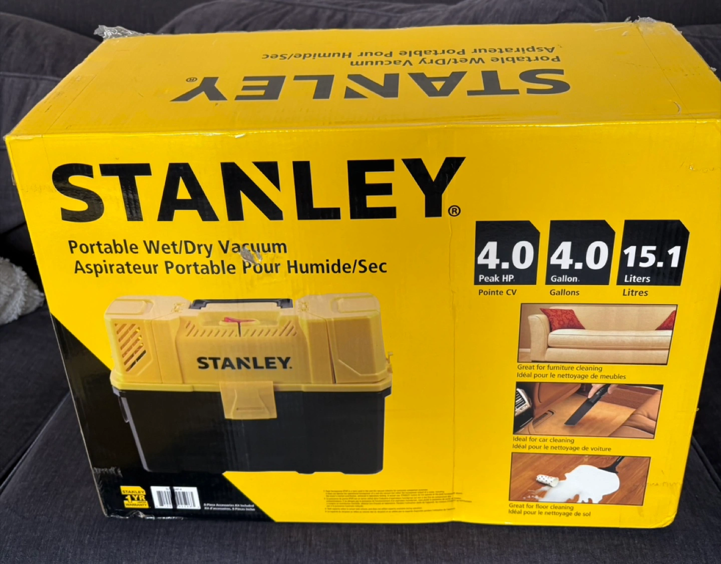 Description: Brand new Stanley wet/dry vacuum cleaner (Model: SL18904P-4). Never used – only opened to check contents. All parts included. Features: • 4.0 Peak HP motor – strong suction power • 4-gallon (15.1L) tank capacity • Suitable for both wet and dry cleaning • Works well on carpets for picking up dust, crumbs, hair, etc. • Note: This is not a deep carpet washer – it doesn’t spray water or shampoo • Great for car cleaning, liquid spills, furniture, and floors • Lightweight and easy to carry with top handle • Comes with multiple attachments and user manual • All accessories store inside the unit – compact and space-saving Perfect for home, garage, workshop, or car use. Price is final, no negotiations. Item is exactly as shown in the pictures