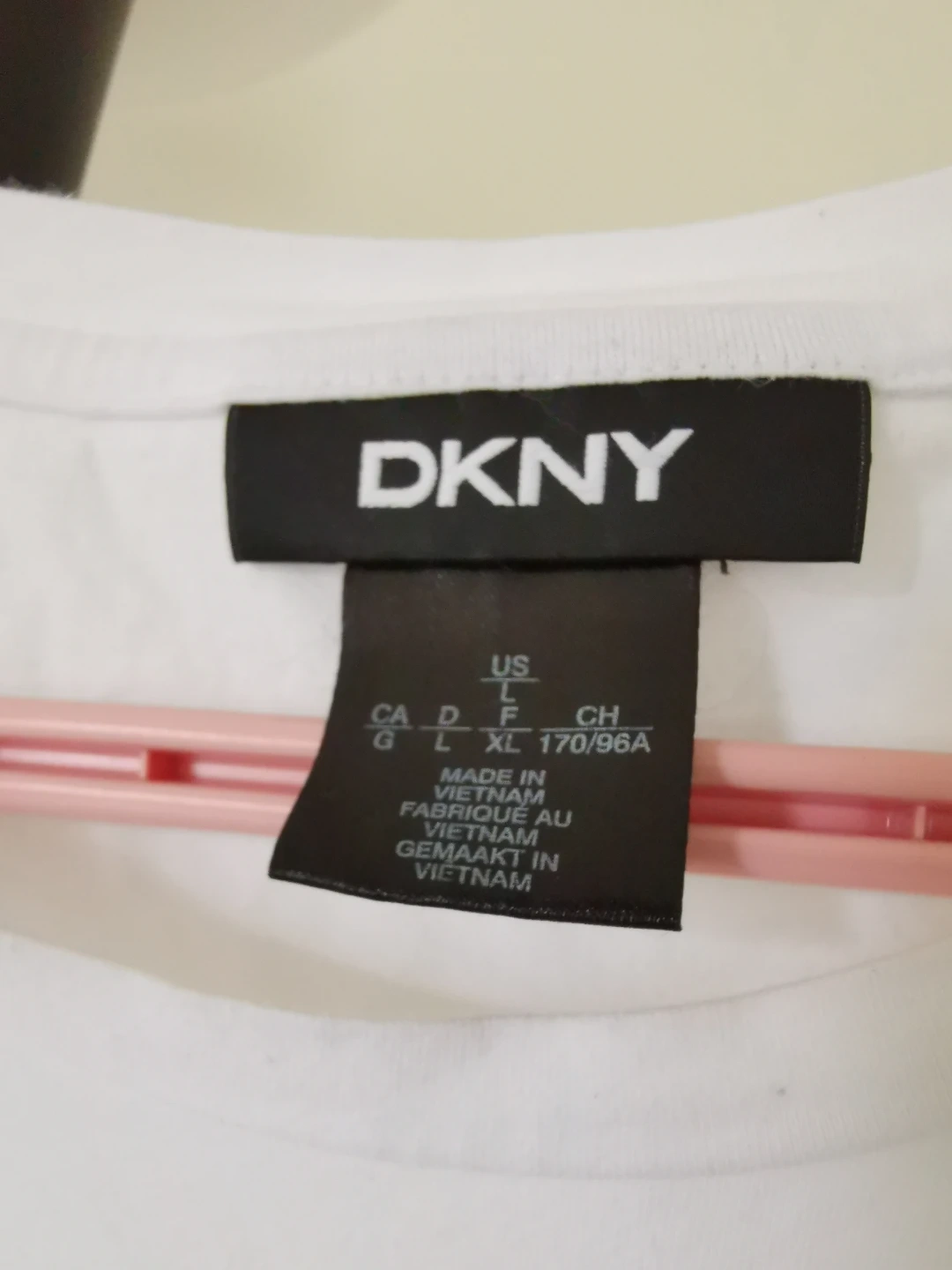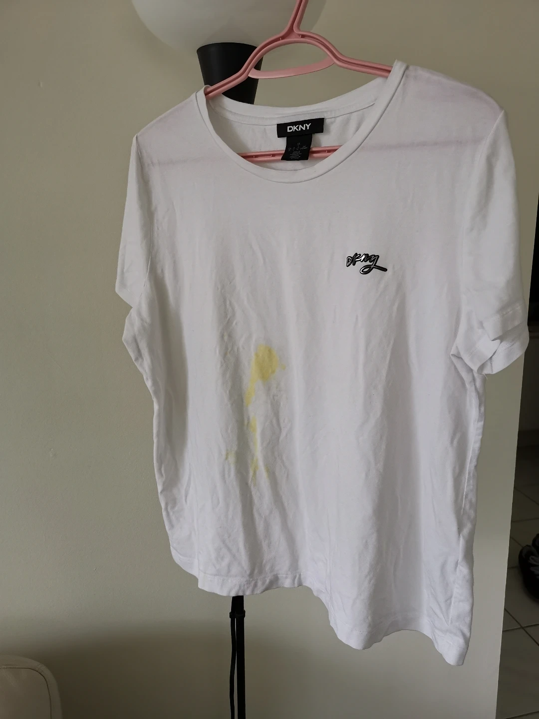 White cotton t-shirt. Short sleeves, crew neck. Small stain. Size large.. Yellow stains in the center. Pet and smoke free home