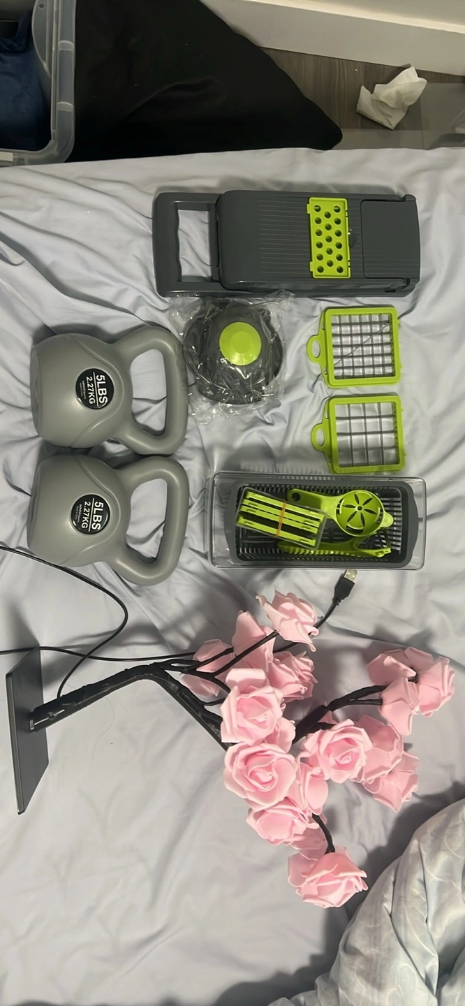 Get fit and cook delicious meals! Two 5lb kettlebells, a multi-functional mandoline slicer with various attachments, a USB-powered rose light, desk lamp. Everything shown in the image included.