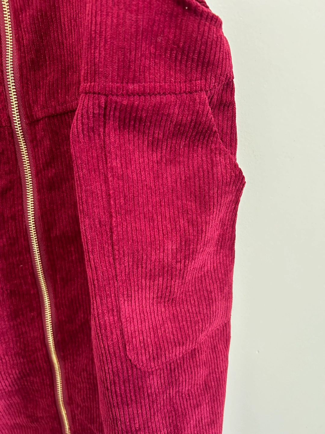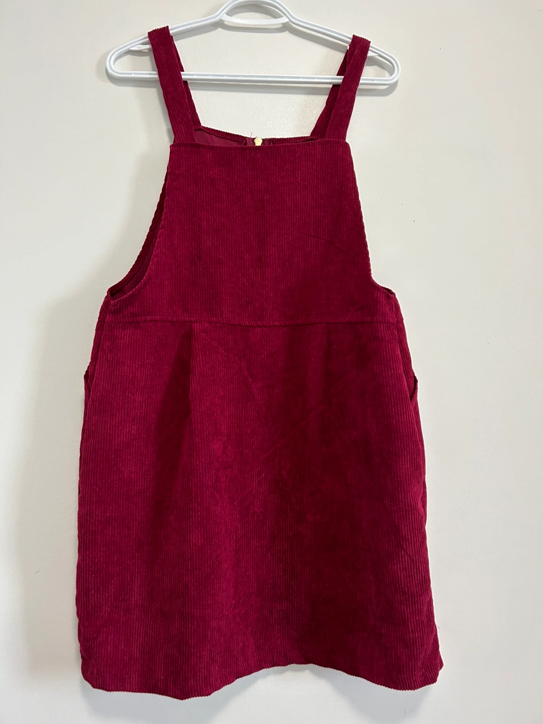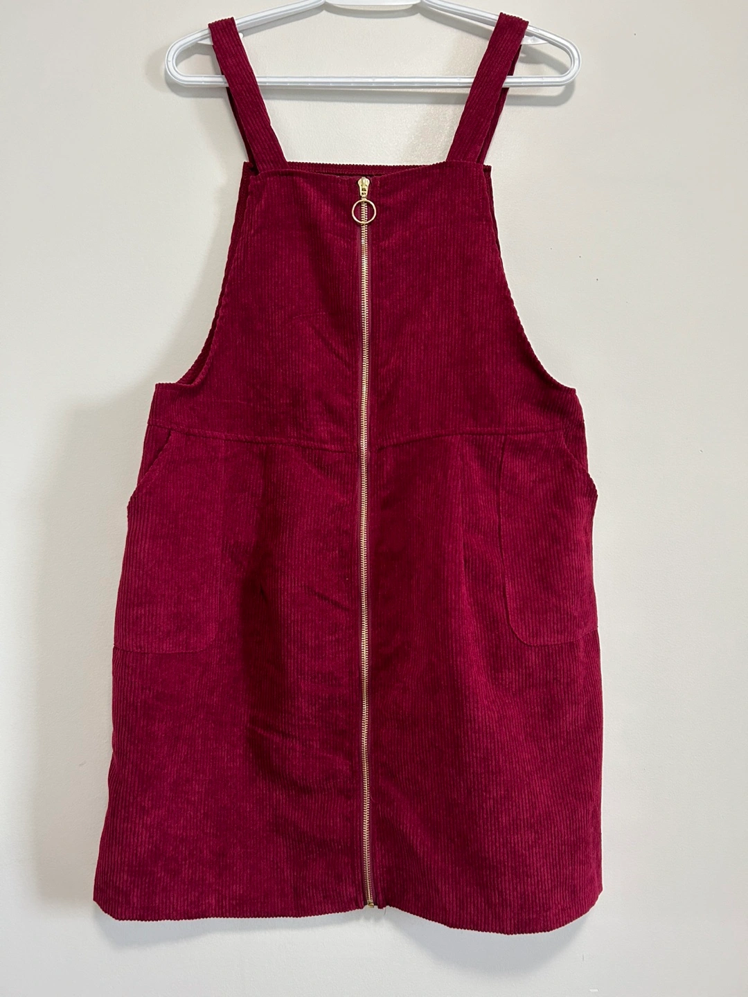 Women's burgundy corduroy pinafore dress. Features a zipper closure and side pockets. Adjustable straps. Great for fall or winter.