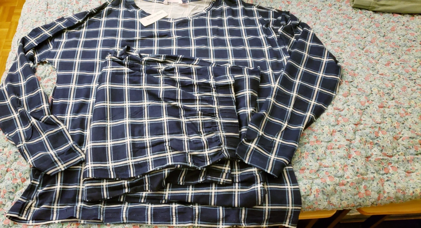 Long sleeve pajama top and pants set. Navy blue and white plaid pattern. Size medium. New with tags.