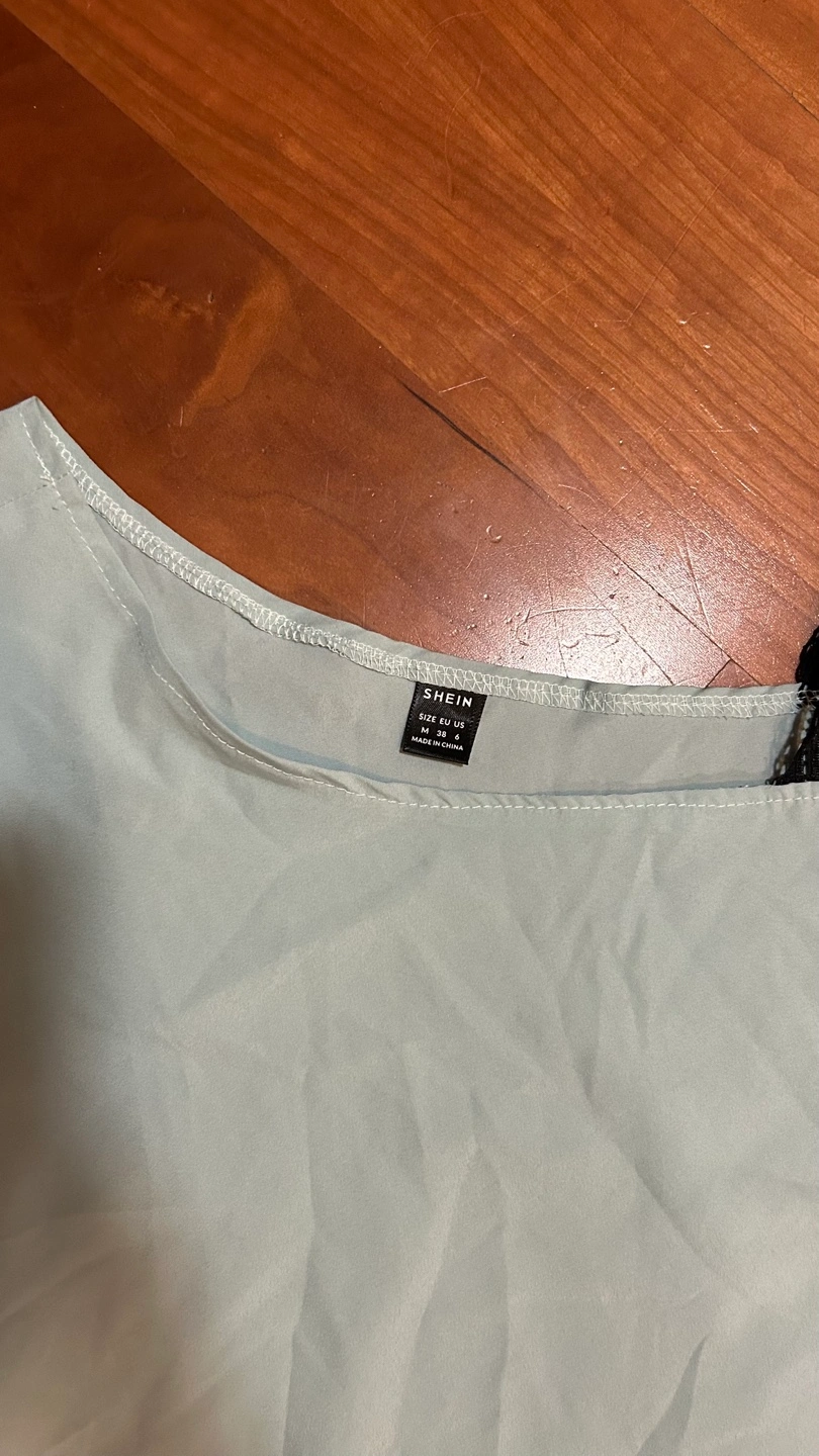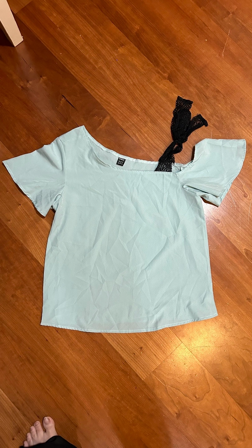 Sage green blouse. Short sleeves. One shoulder detail with black lace accent. Size M