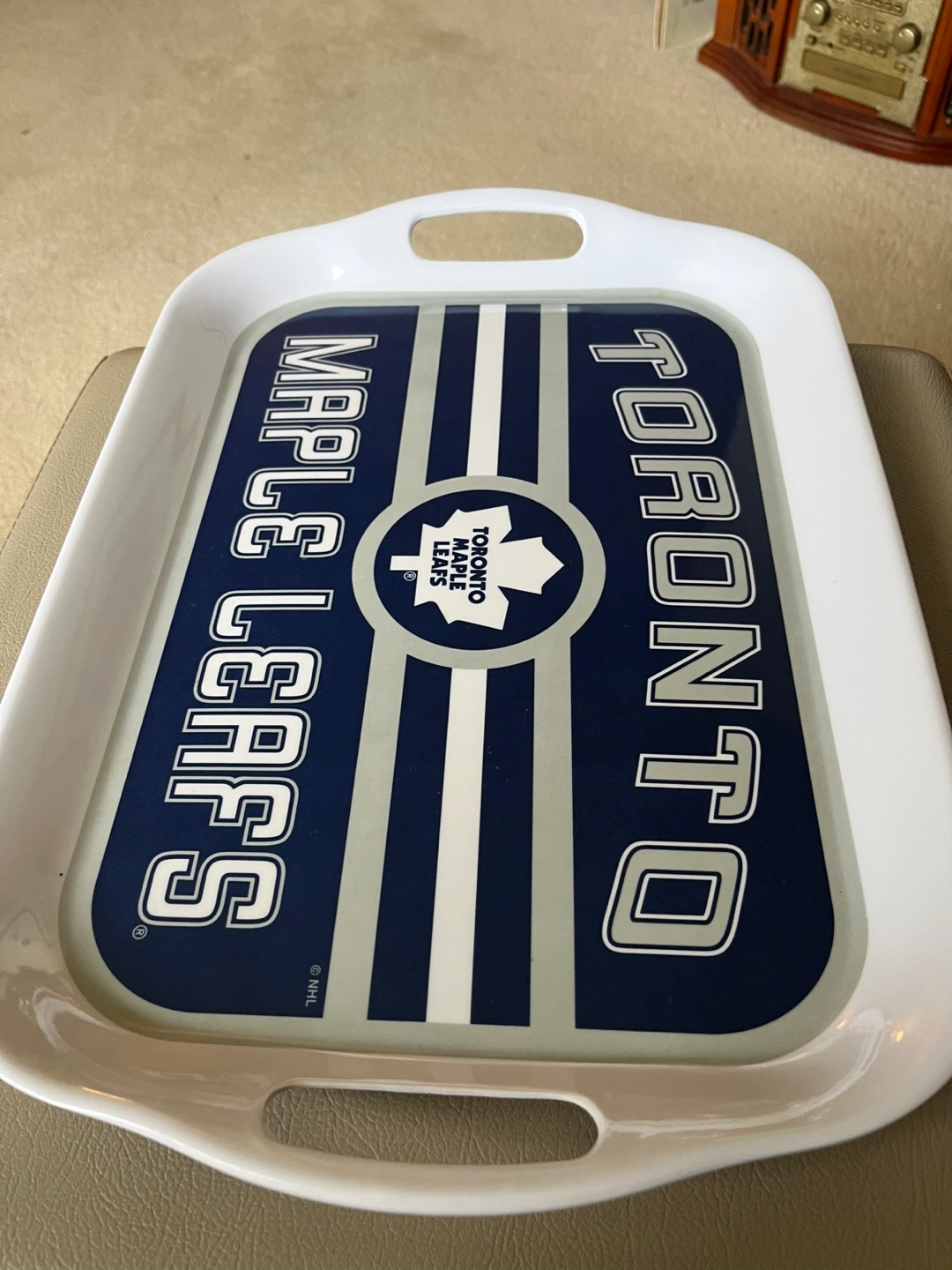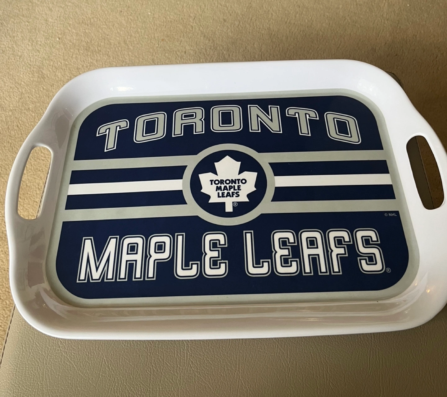 Leafs melamine tray. Official licensed merchandise, originally purchased at the Hockey Hall of Fame years ago, but never used. Original stickers still on it. 2 handles for easy carrying. 15.75” x 11”. Available for pickup in Markland Wood.