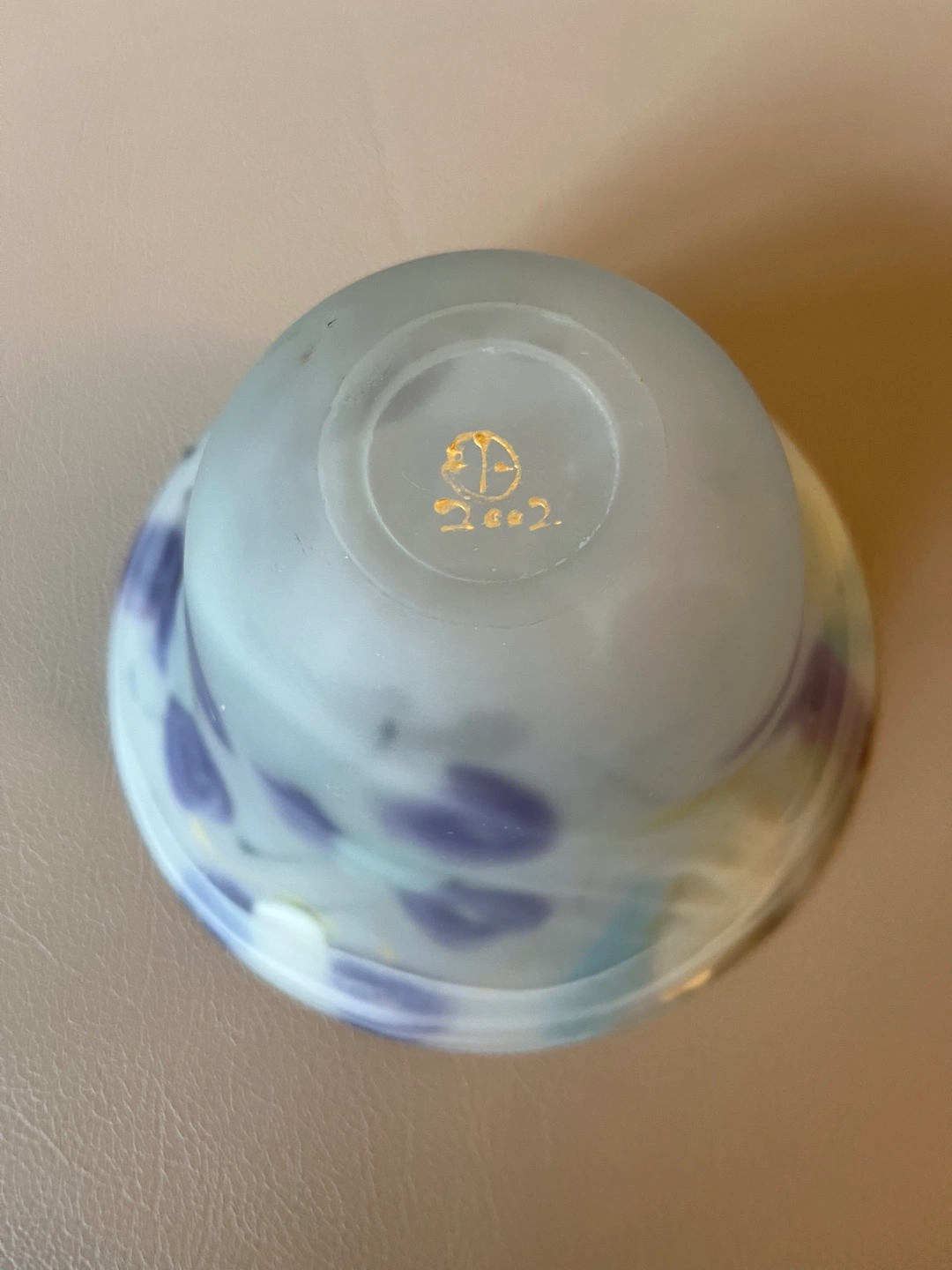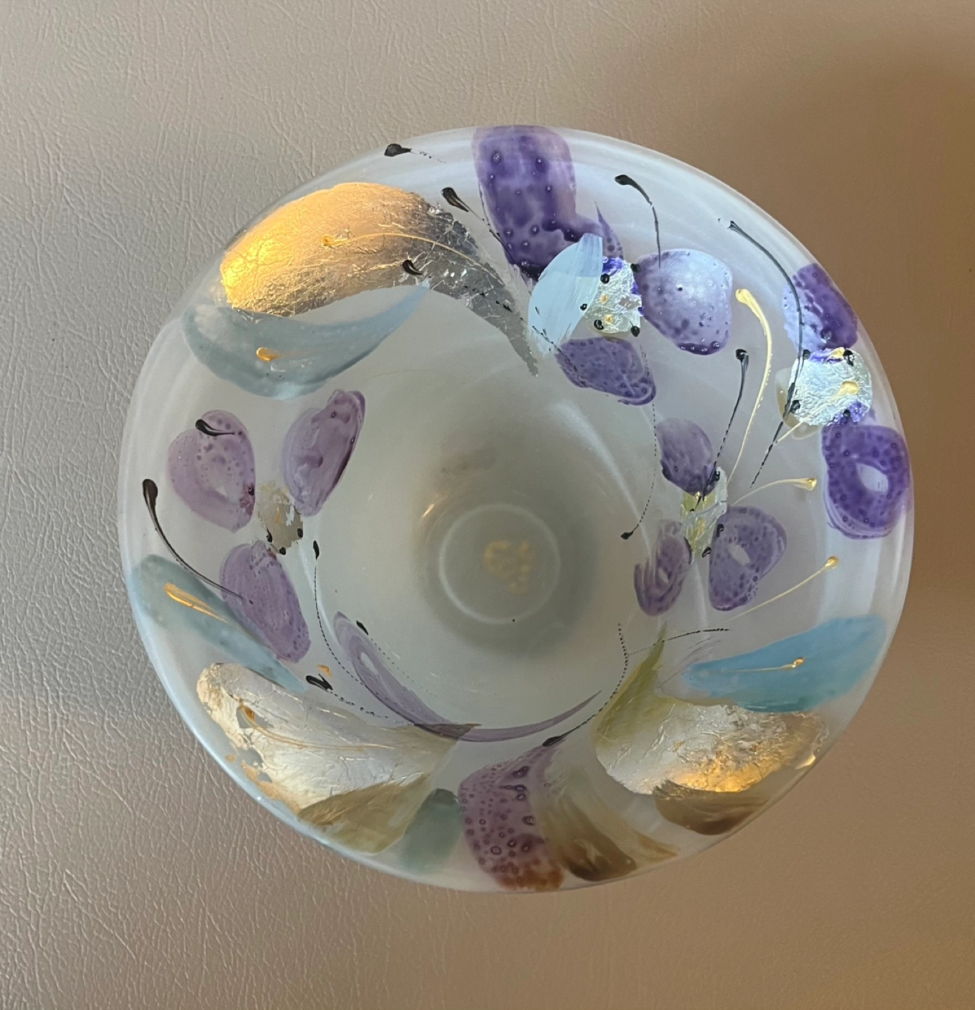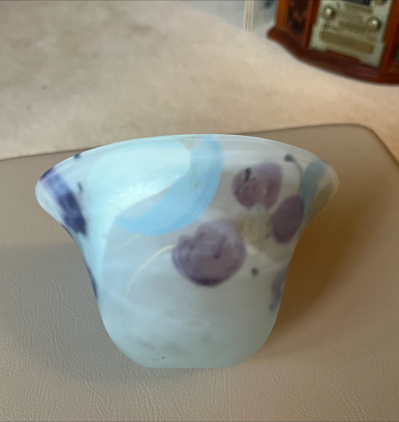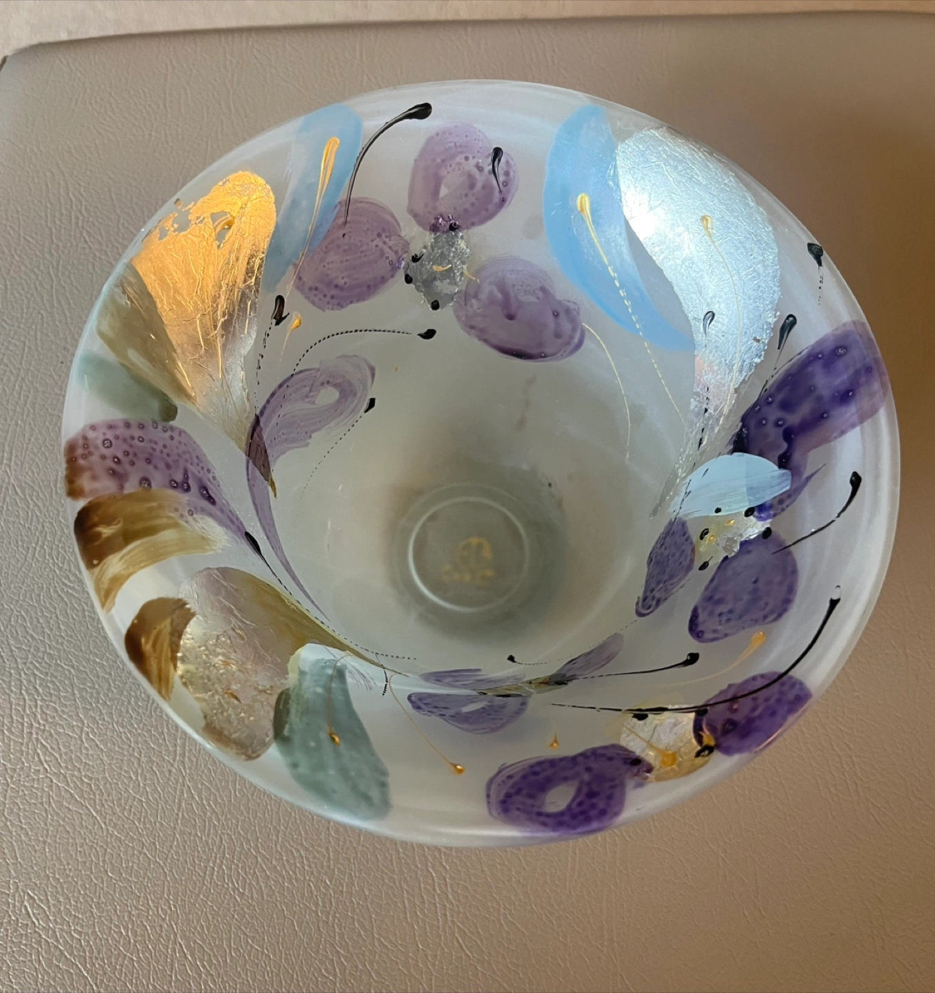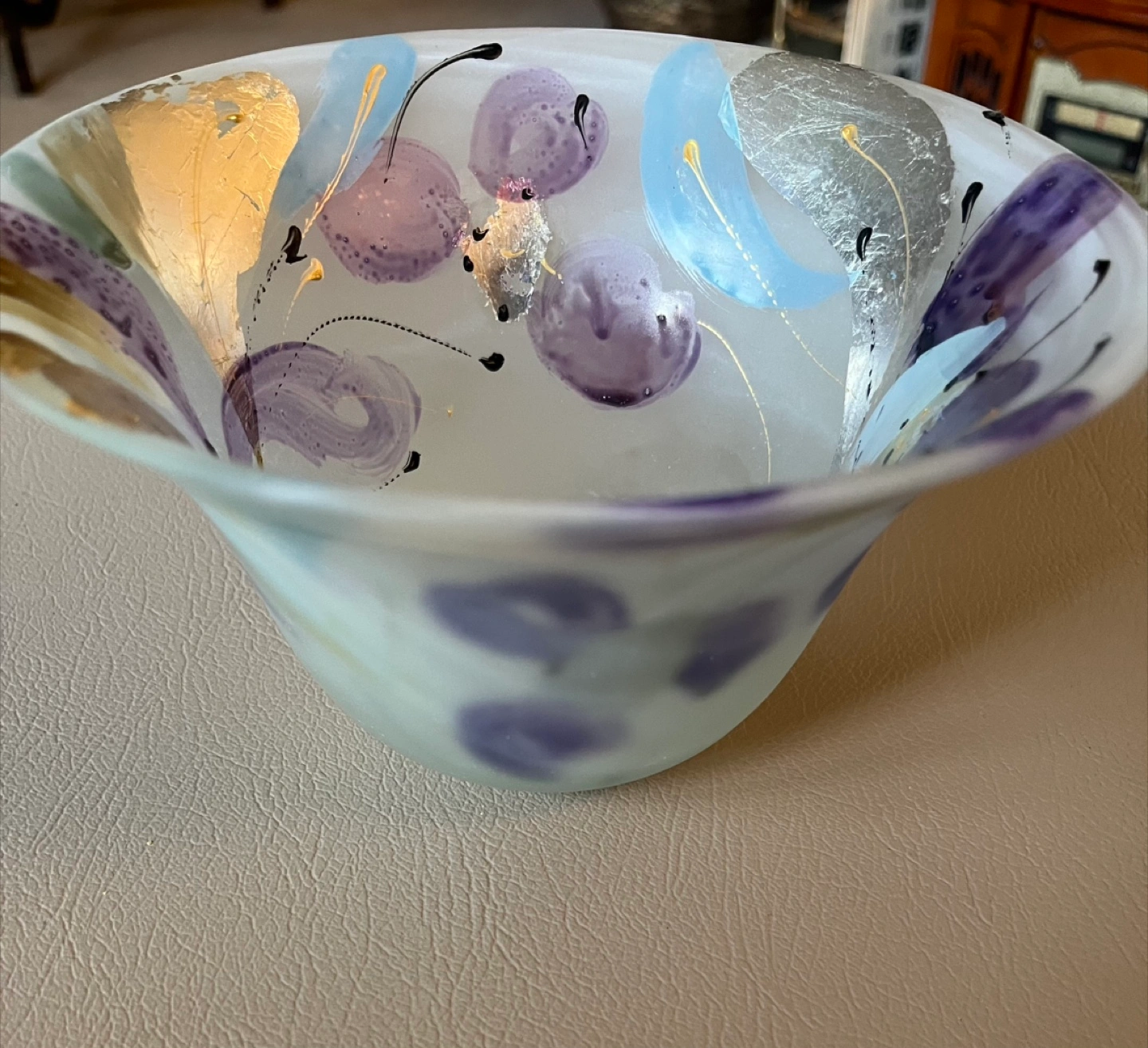 Small glass bowl. Features a hand-painted abstract design on the inside with purple, blue, silver, and gold accents. Frosted glass on the outside allows the design to peek through. Says 2002 on the bottom. Unique piece for home décor. 6.5” around at widest, 3” at base, 4” high. Available for pickup in Markland Wood.