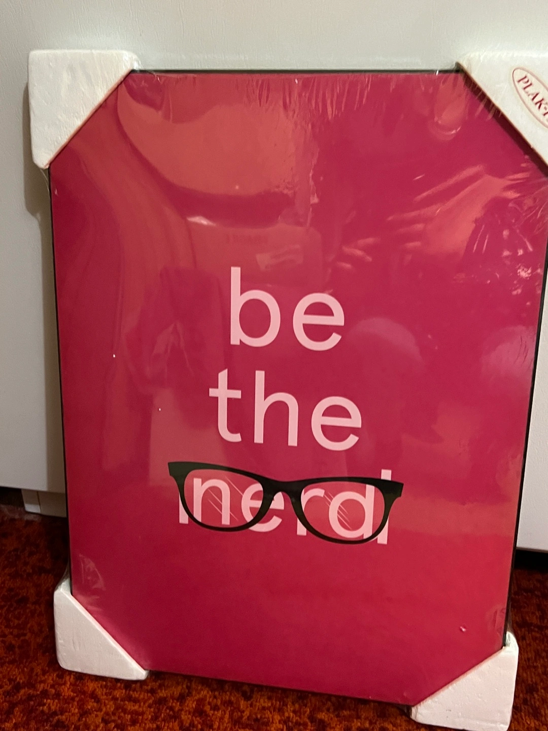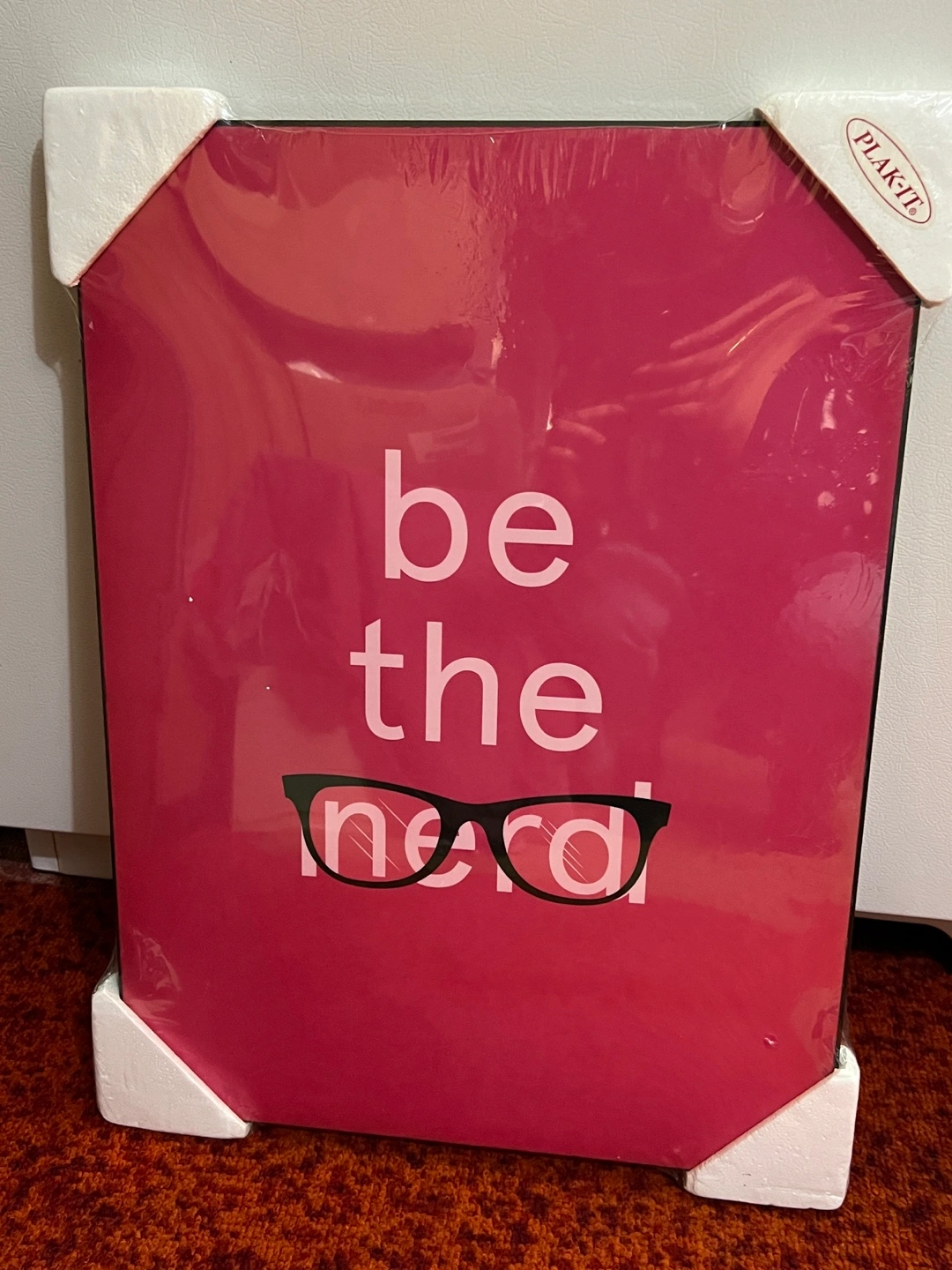 Pink framed art print. Features the phrase 'be the nerd' with glasses graphic. New in plastic packaging. Ready to hang. Brand new Cash only Thank you