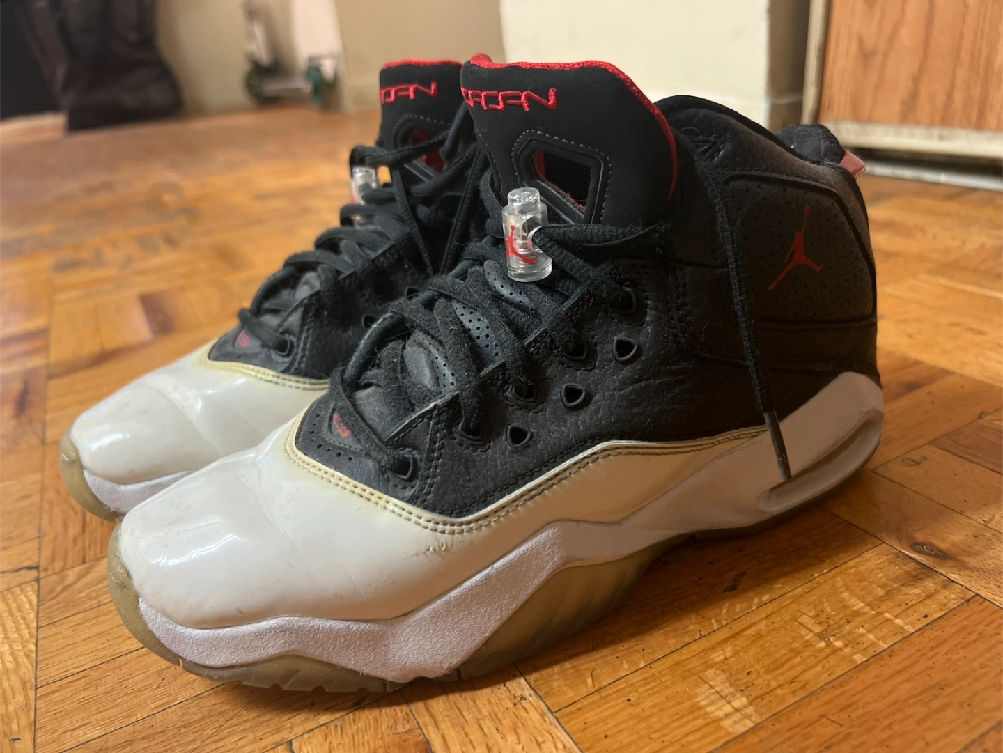 Kids' size Air Jordan 6 Rings basketball shoes. Black and red colourway. Mid-top style. Pre-owned condition.