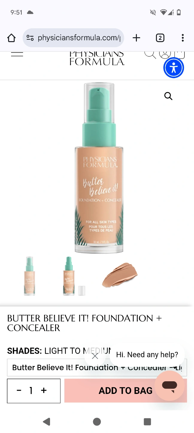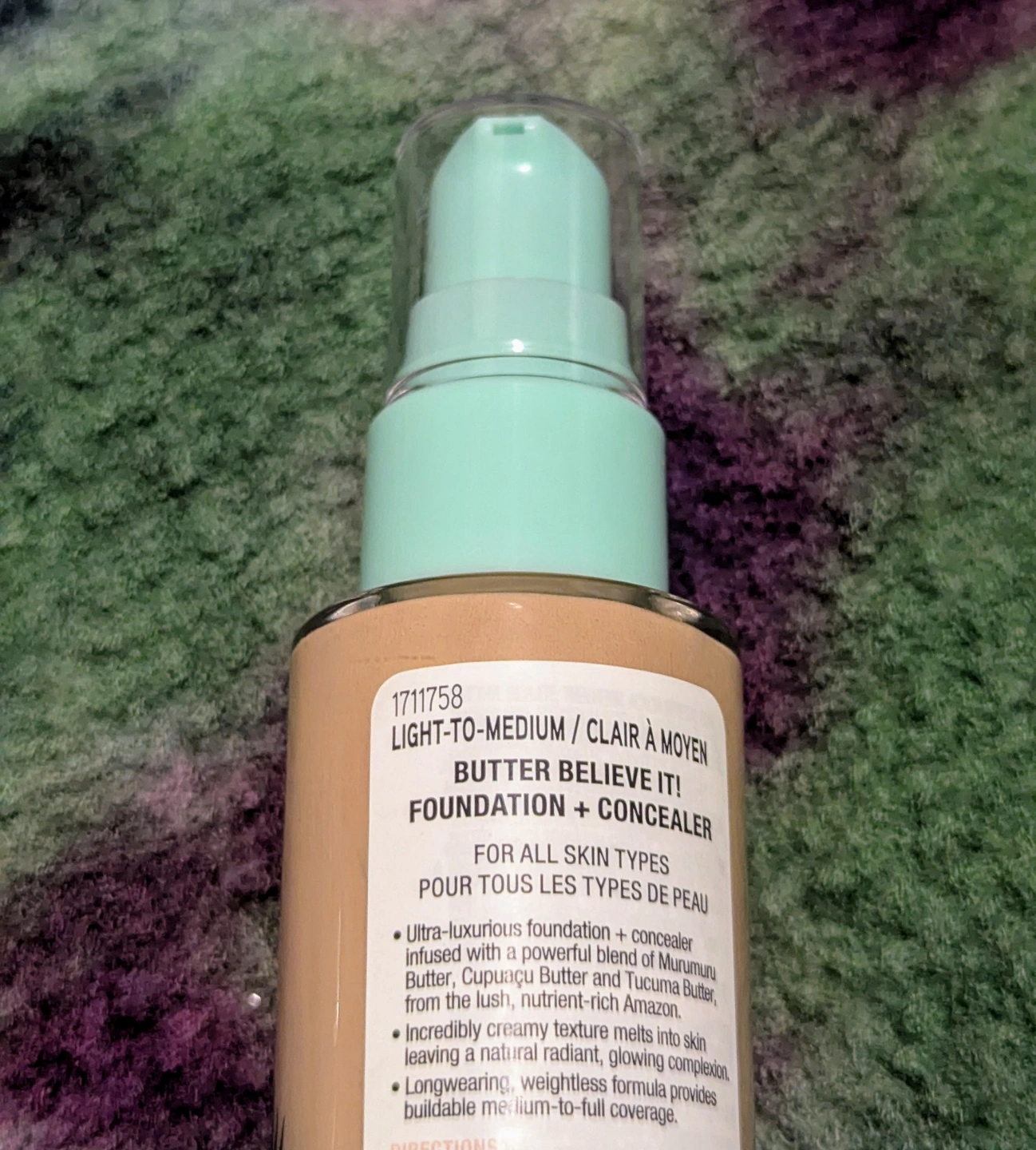 Brand new without box. Never used. Size: 30 ml/ 1 FL oz bottle. Shade: Light-to-Medium Retails for approx. $28 with tax. Physicians Formula Butter Believe It! Foundation + Concealer. For all skin types. Incredibly creamy texture melts onto skin leaving a natural radiant glow, long-wearing, weightless formula provides buildable coverage. Pump dispenser.
