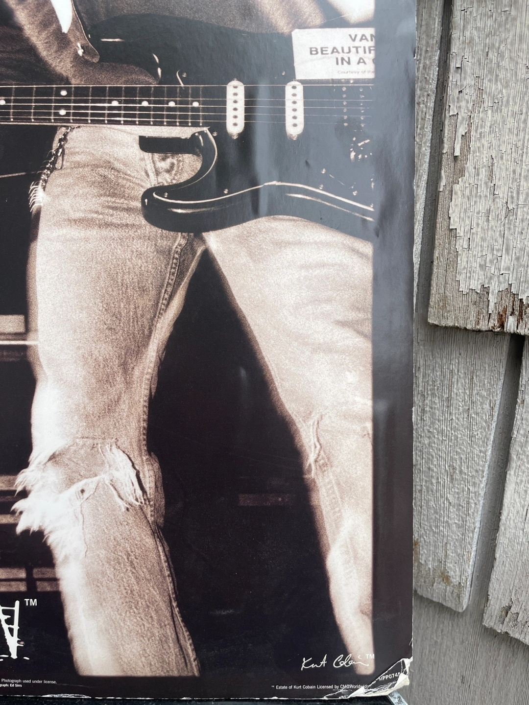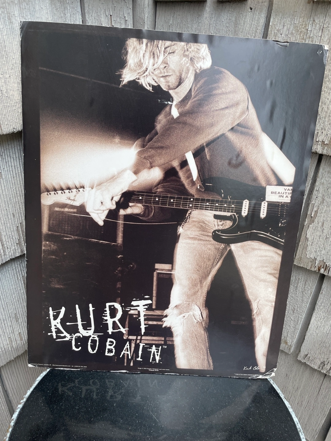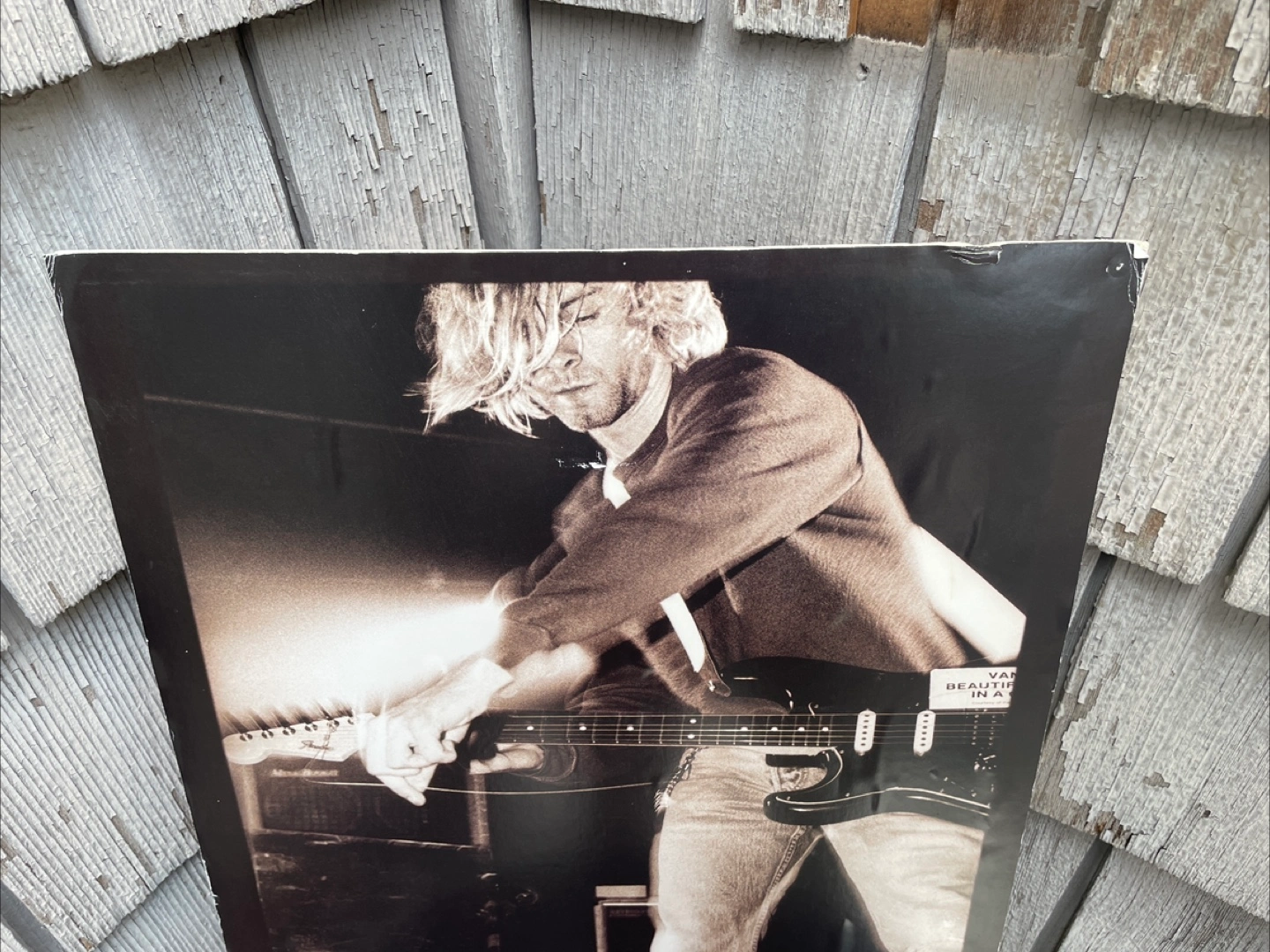 Large format poster featuring a black and white photo of Kurt Cobain playing guitar. Some minor wear and tear. A collectible for Nirvana fans.