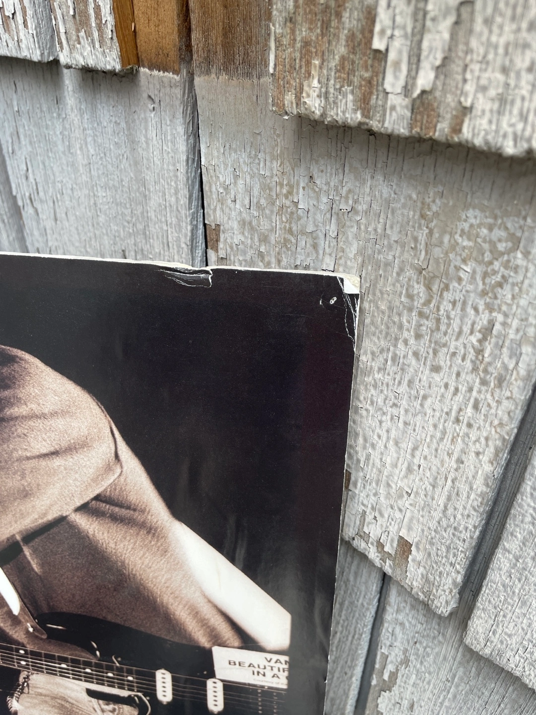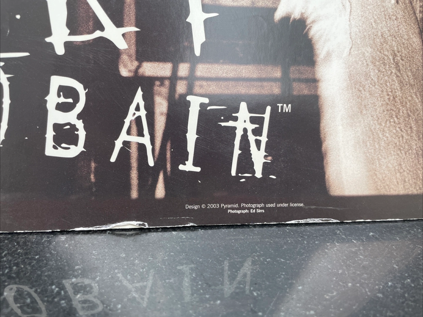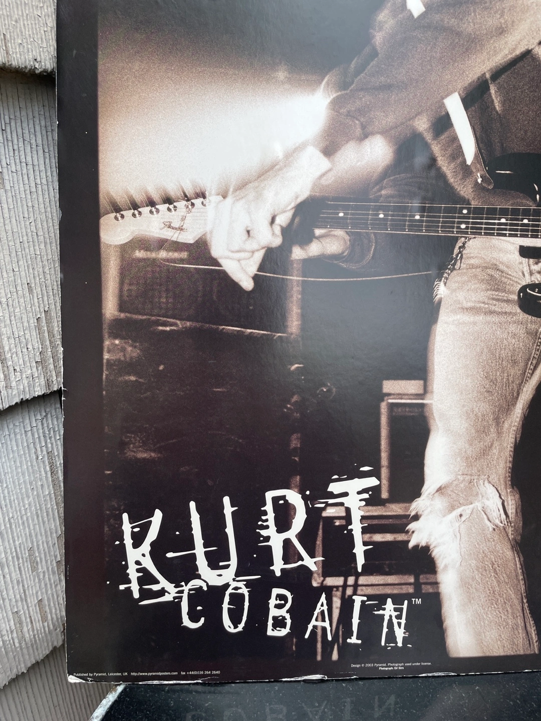 Large format poster featuring a black and white photo of Kurt Cobain playing guitar. Some minor wear and tear. A collectible for Nirvana fans.