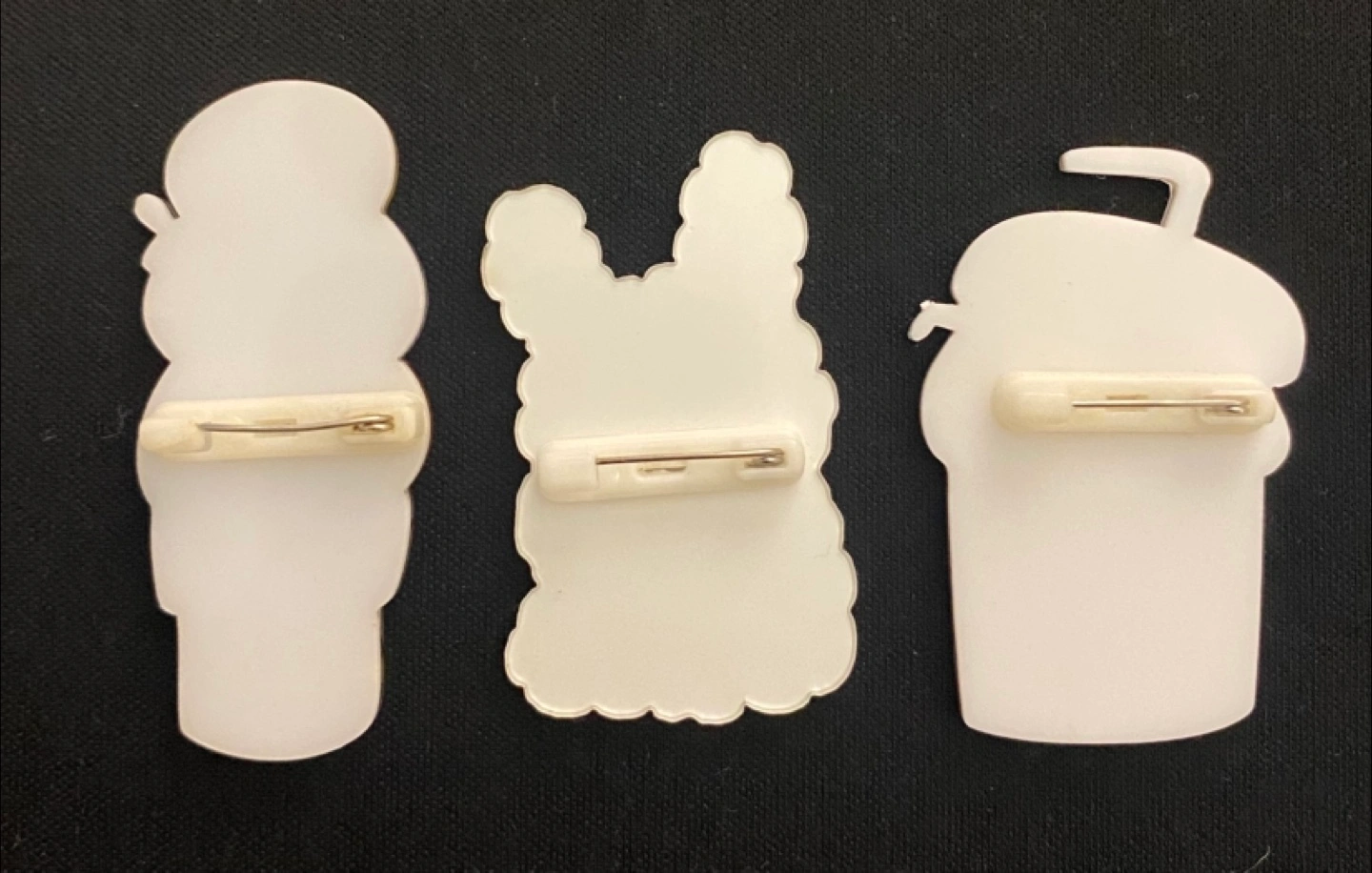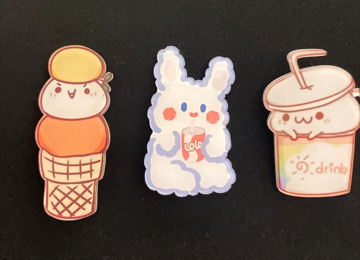 Ice cream ✅ Available. COLA BUNNY ❌ SOLD. Drink ✅ Available. $1 each Adorable kawaii-style acrylic pins. Features an ice cream cone, bunny, and a drink. Perfect for bags, jackets, or hats.