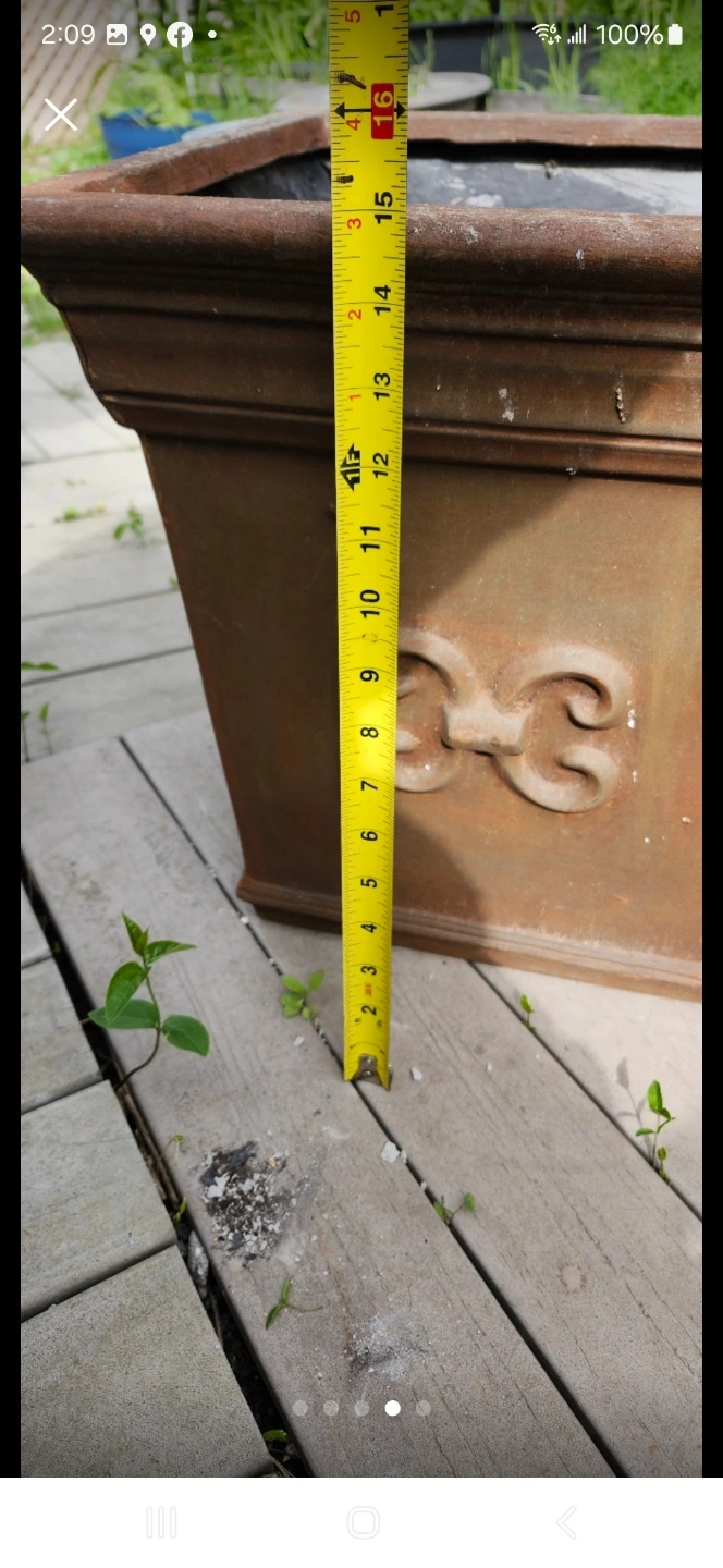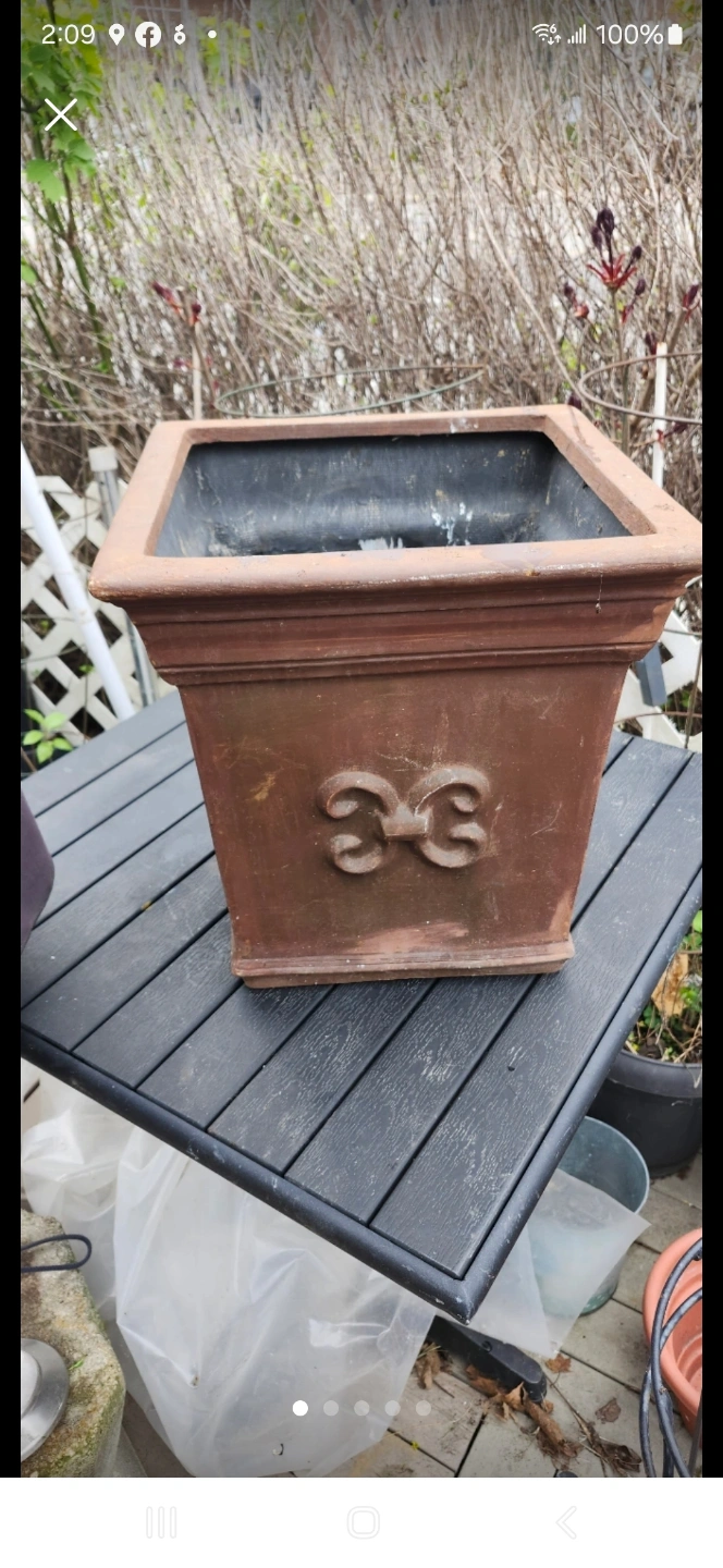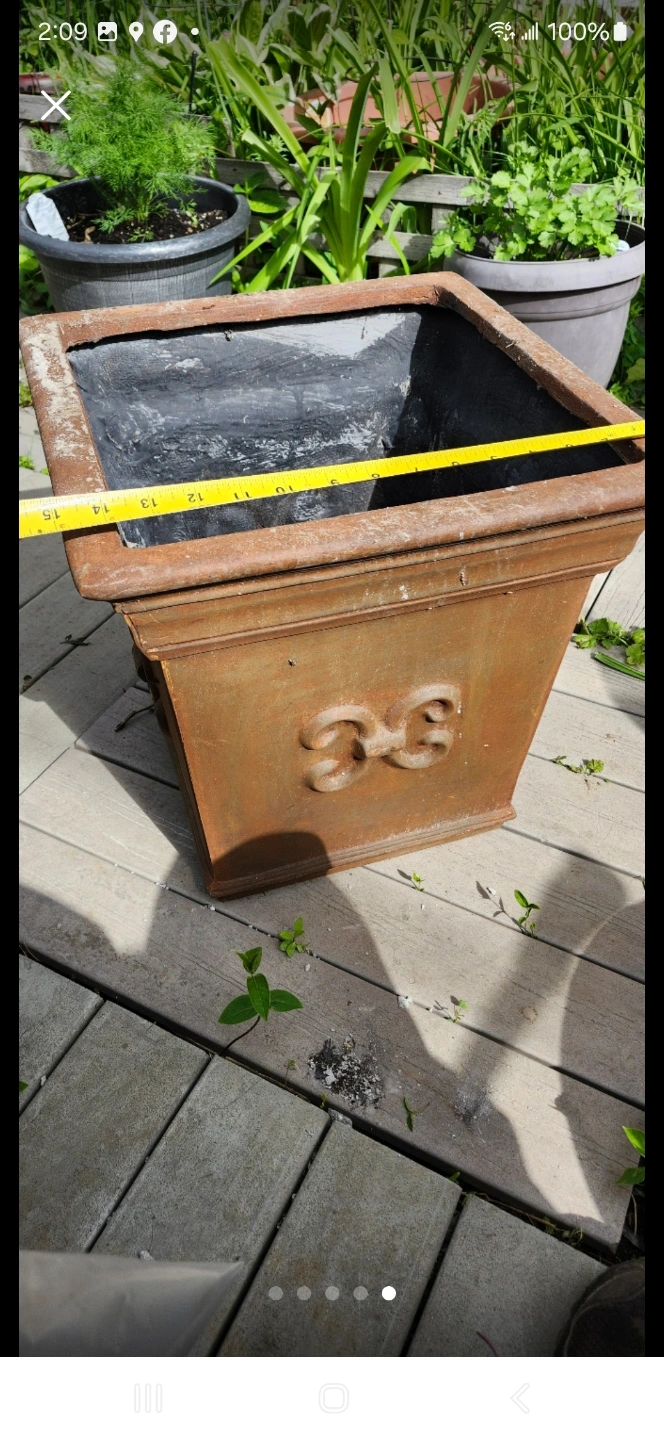 Rustic brown square planter. Ornate detailing on one side. Measures approximately 15 inches across and 15 inches tall. Great for outdoor use. excellent condition price only cash only pickup no delivery. 801 O'Connor drive outside TD Canada Trust bank door.