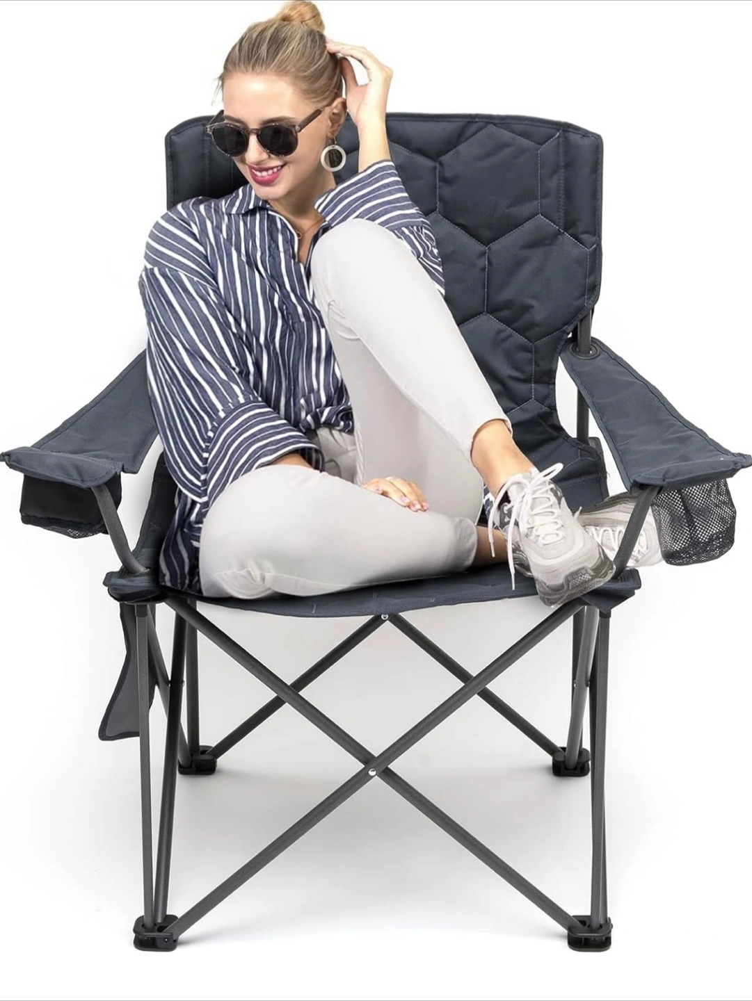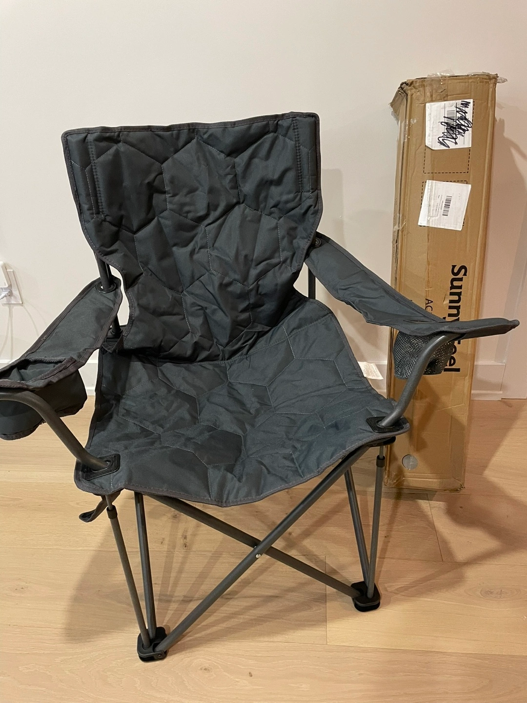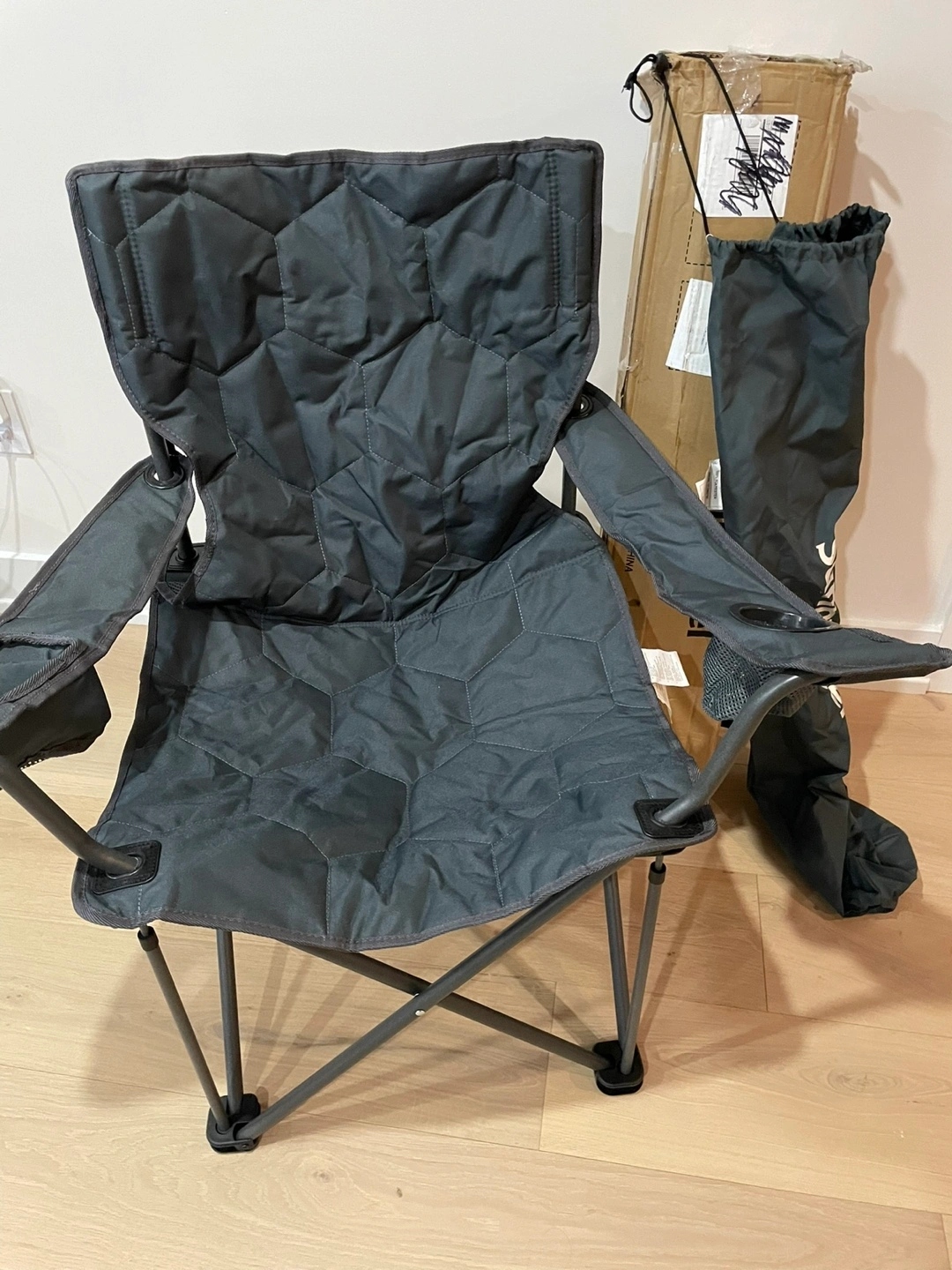 SUNNYFEEL Oversized Heavy Duty Padded Camping Chair w Carrying Case. Grey. Brand New in Box. $40 firm Reg. Price: $83 +HST