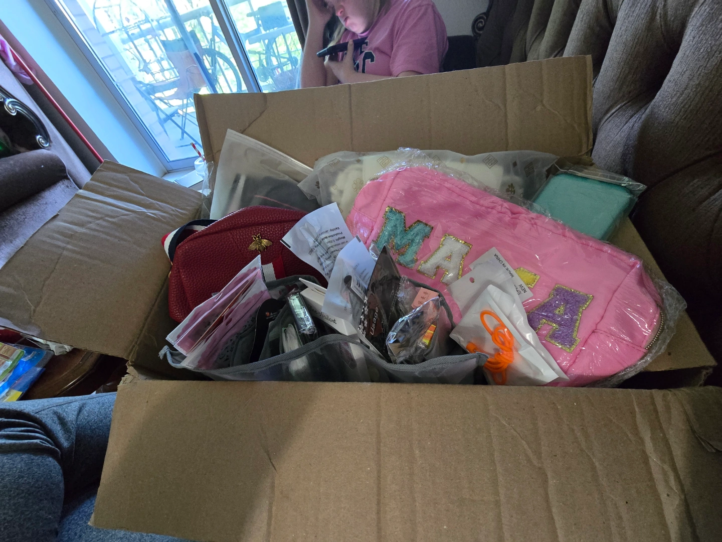 Grab bag of various beauty and accessory items. Includes a pink makeup bag, a red crossbody bag, and other small items. Perfect for a gift or for personal use.