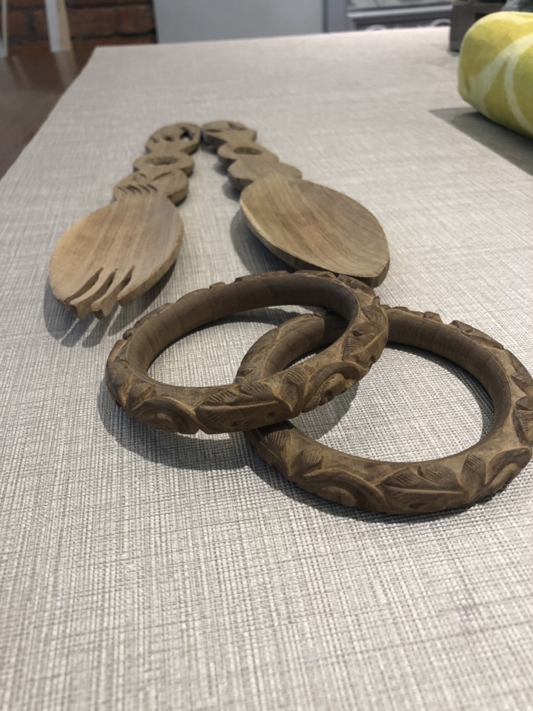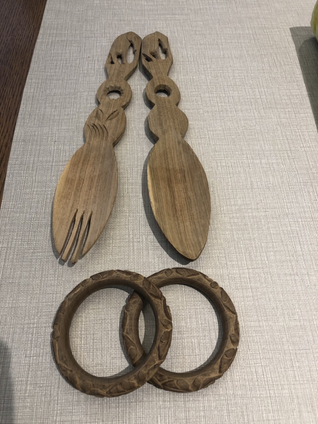 Carved wooden salad tongs. Could use food safe oils to bring out grain and colour. Fee for the taking!
