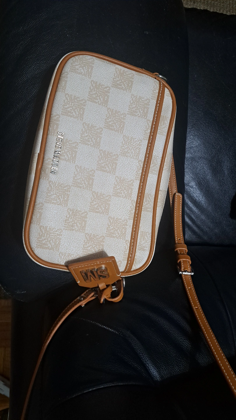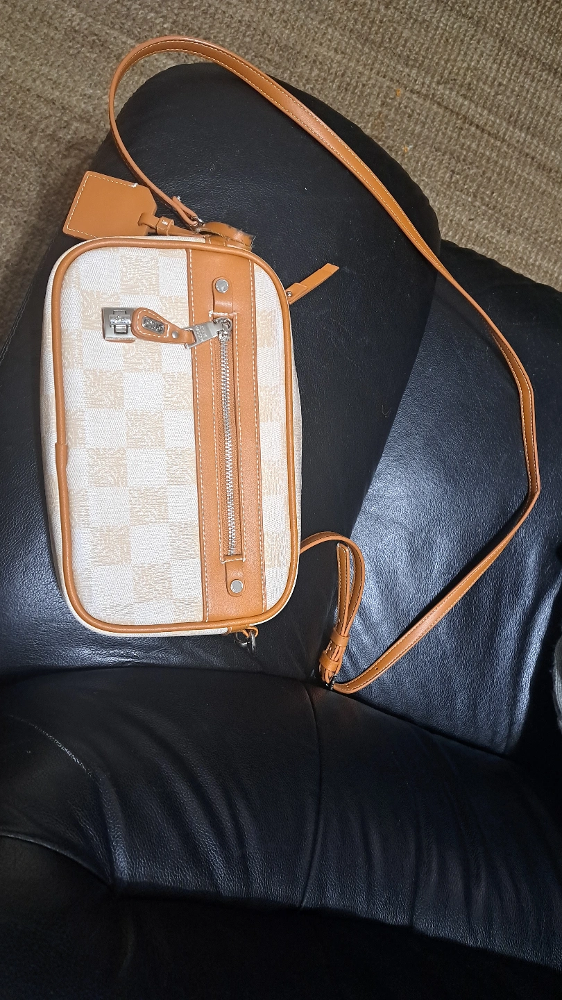 Beige and brown crossbody bag. Features an adjustable strap and zipper closure. Stylish and compact design. Perfect for everyday use.
