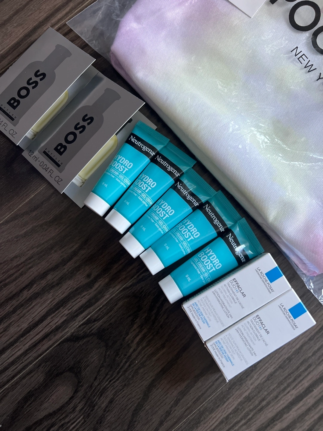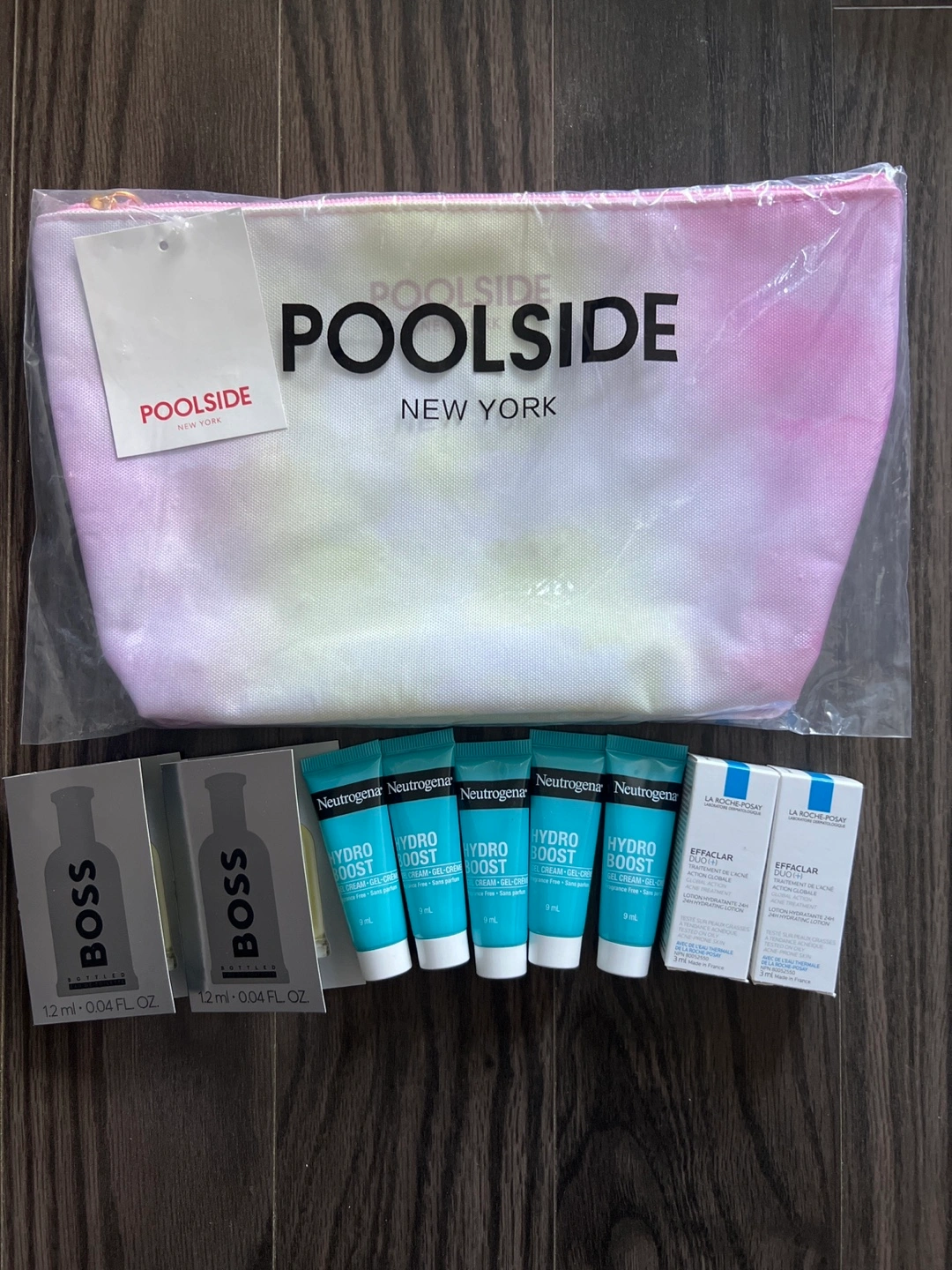 New Poolside New York makeup bag. Includes several skincare samples: Neutrogena Hydro Boost and La Roche-Posay Effaclar. Also includes two Boss bottled fragrance samples.