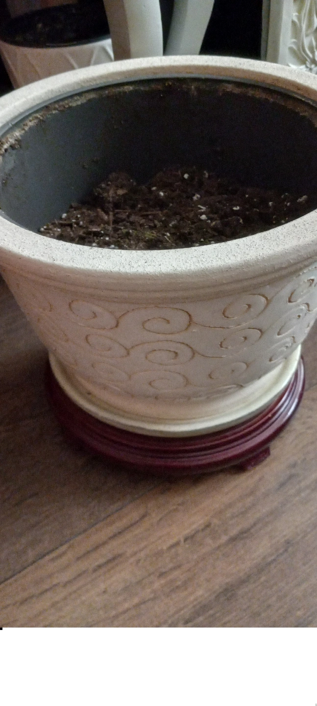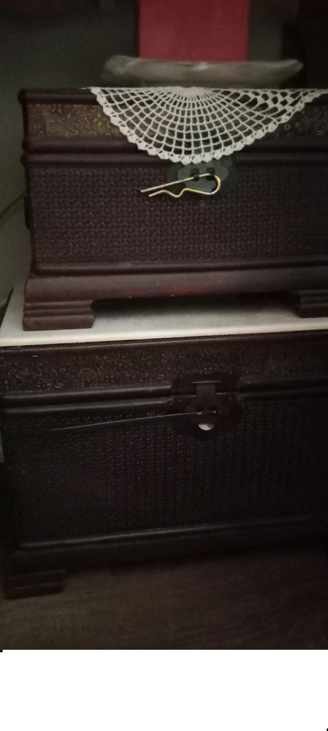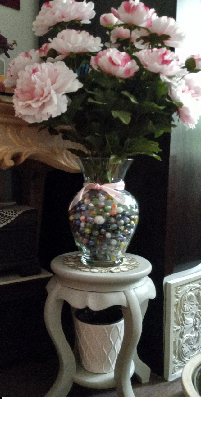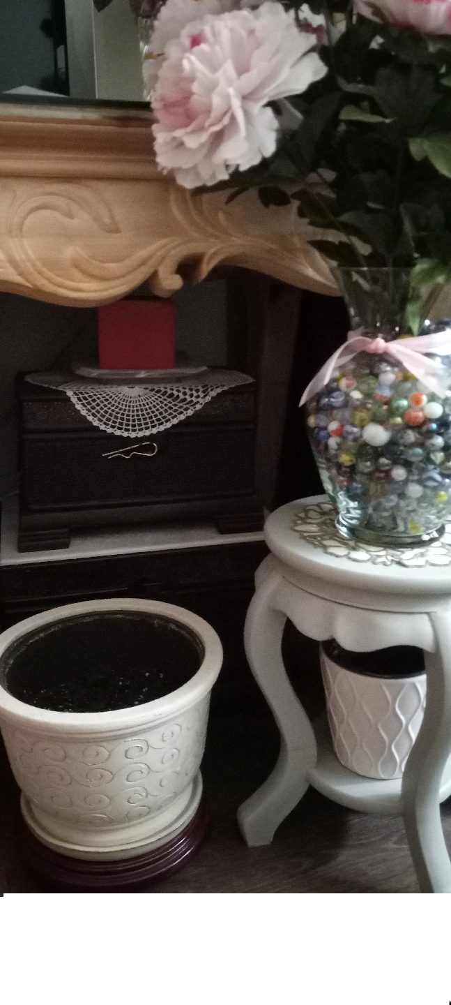 Set of two decorative boxes. Dark brown, ornate detailing. Matching design. One is slightly smaller. Also included, a large off-white planter. Features an embossed design. Wooden base., also a glass vase w peonies and 40yr. old marbles..w a hand painted dove gray plant stand.