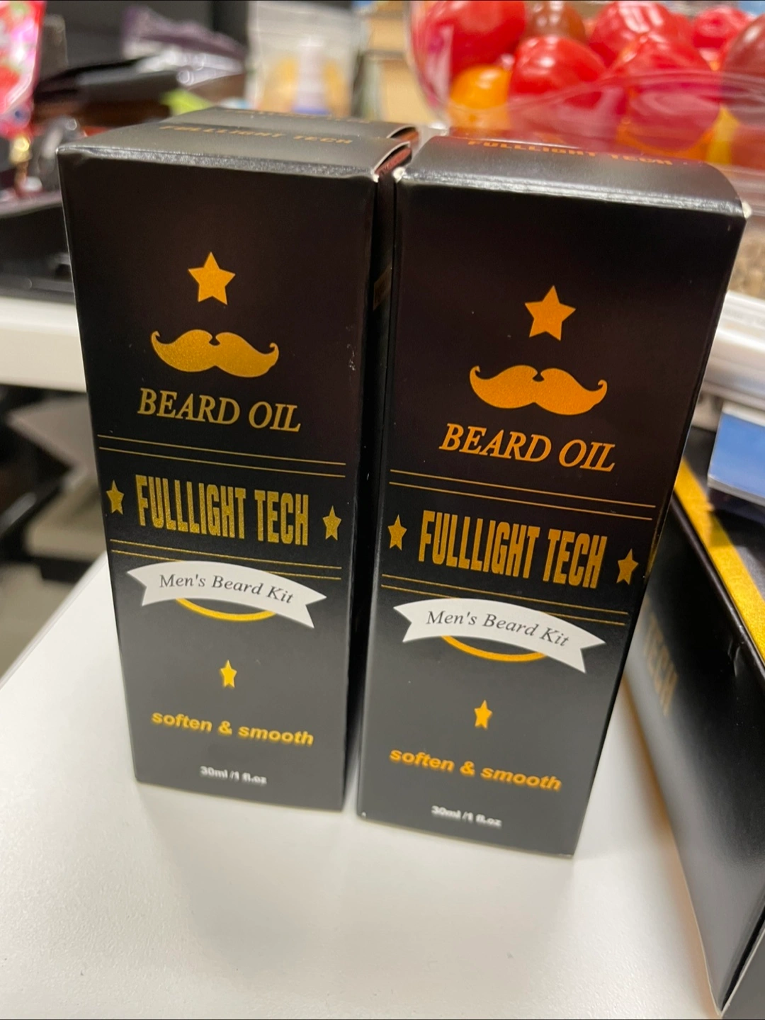 Two bottles of Fulllight Tech beard oil. 30ml each. Soften and smooth. Fragrance free, natural, vitamin E. Ingredients include various oils. $5 each $20 all four