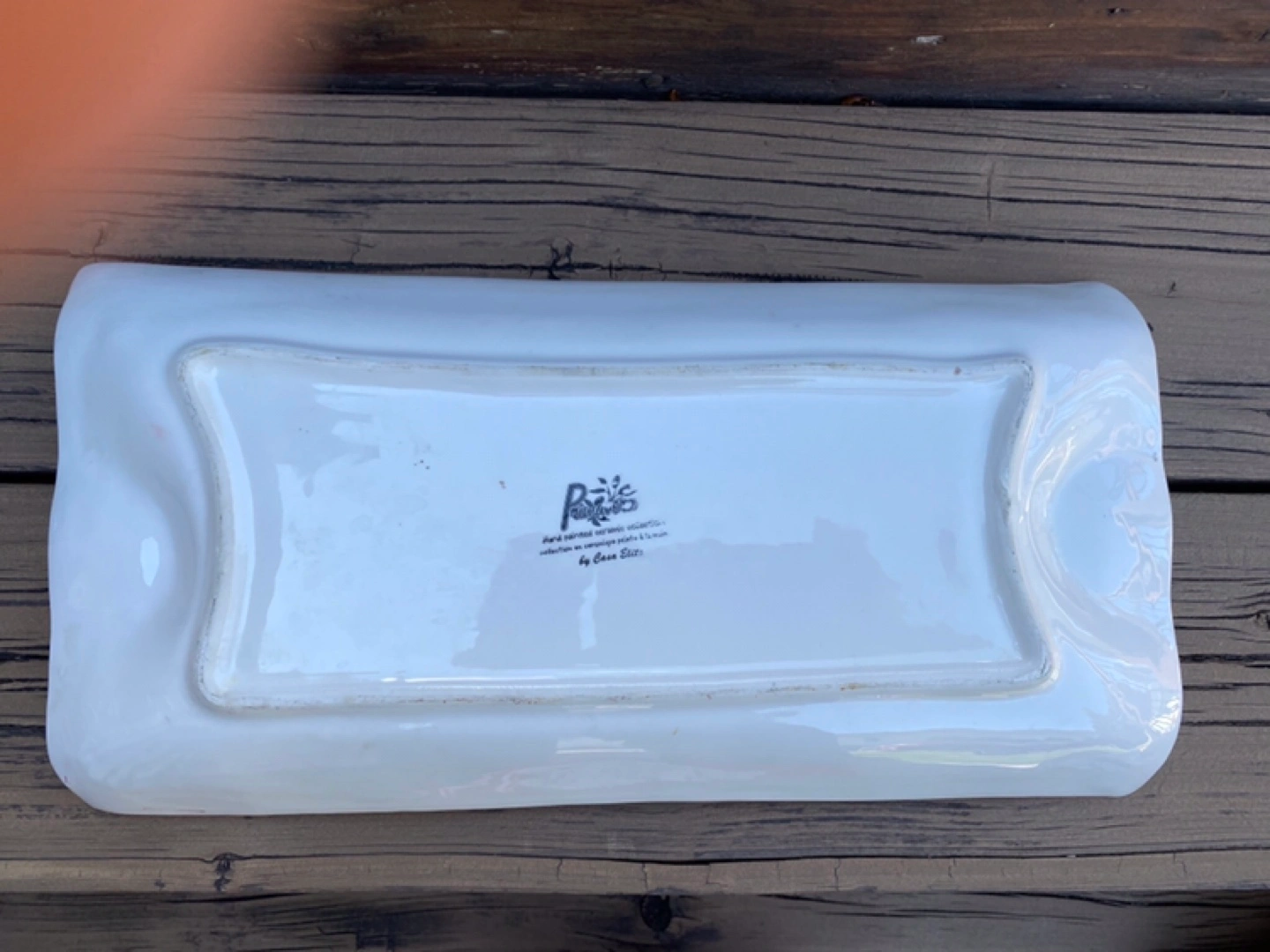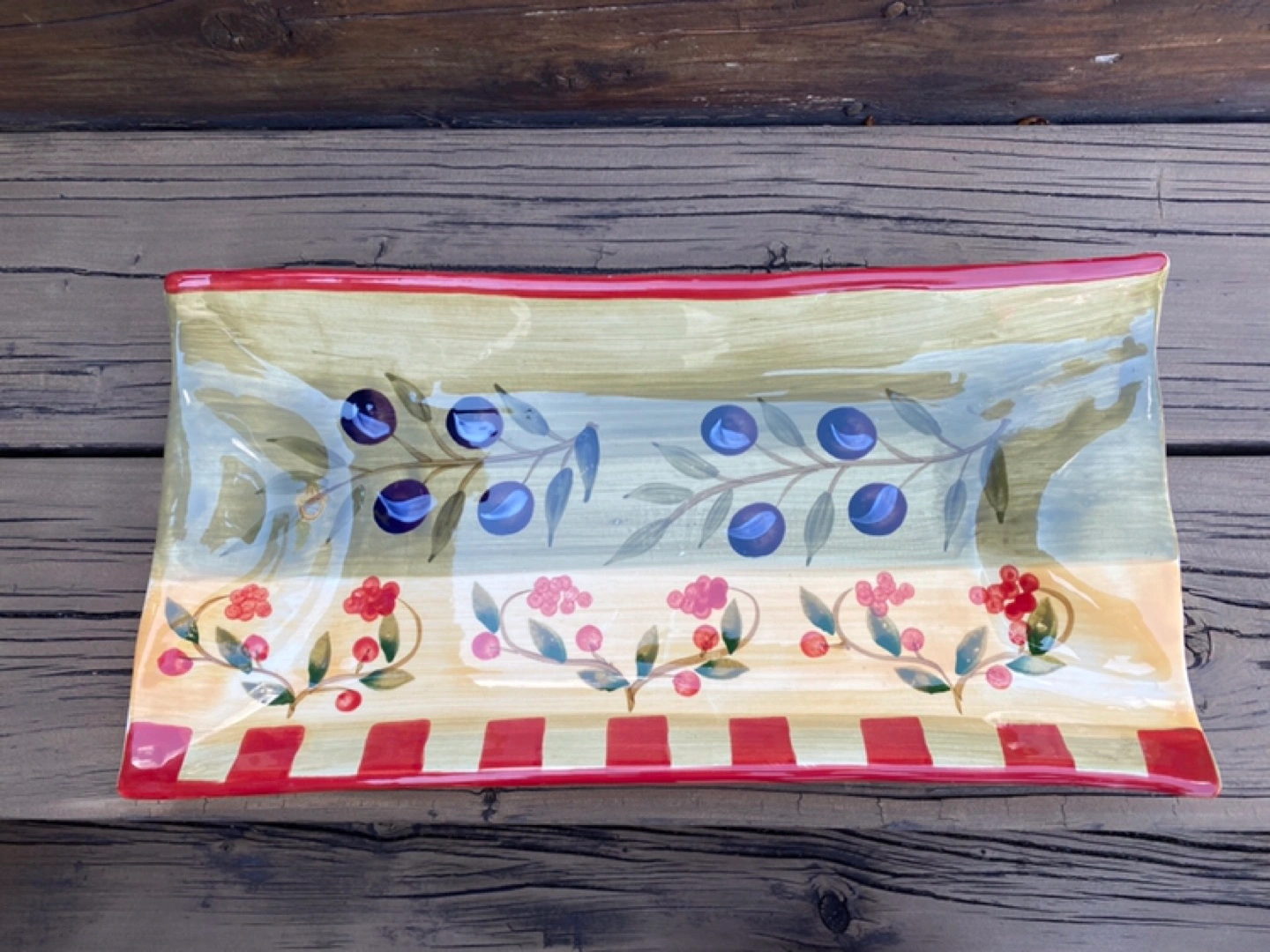 Rectangular ceramic serving platter, featuring an olive branch design. It is Hand-painted and is 14 1/4 inches by 7 inches. Perfect for serving appetizers or bread.