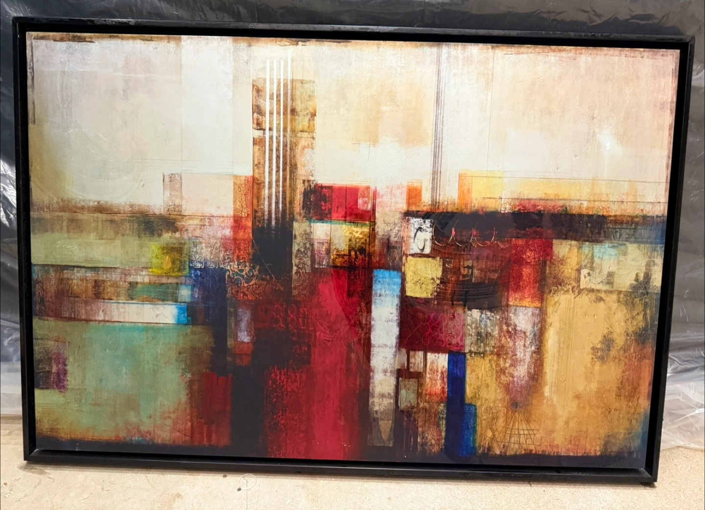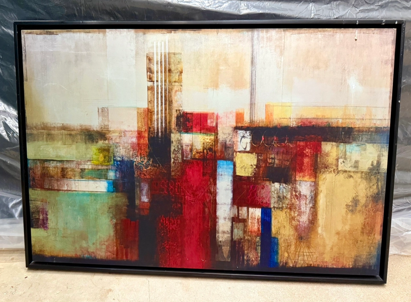 Modern abstract artwork. Framed in black. Features muted earth tones and reds. Large format, great statement piece.