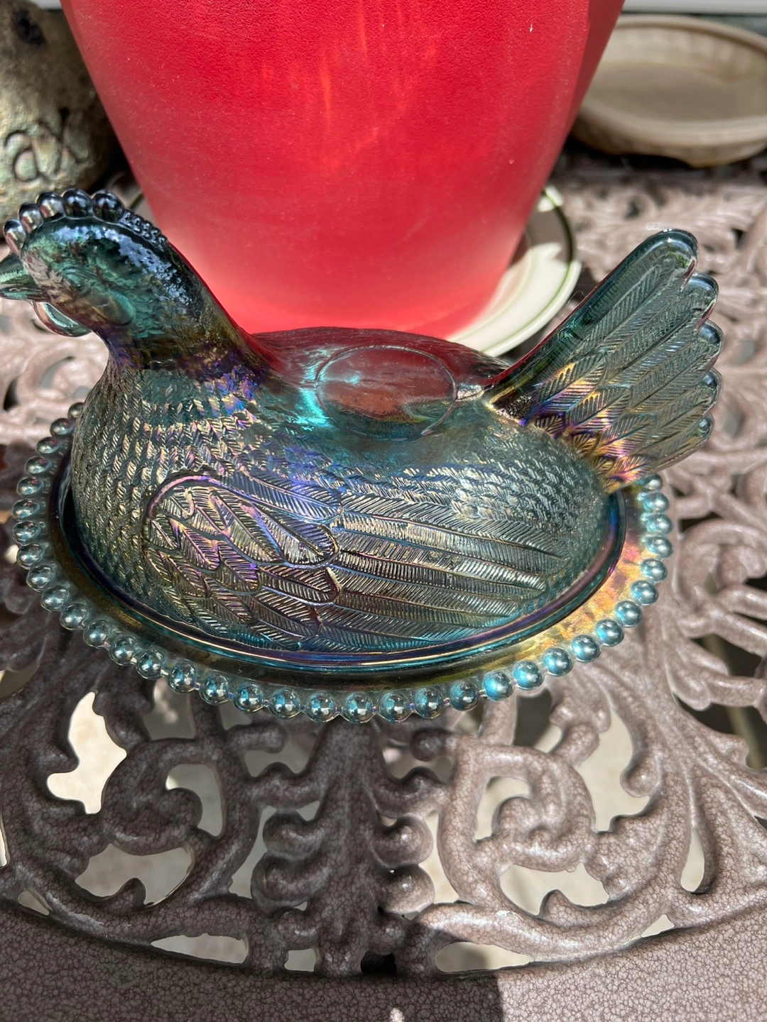 Beautiful vintage glass hen-shaped butter dish. Iridescent colours. Detailed hen design. Beaded edge. Unique collectible.