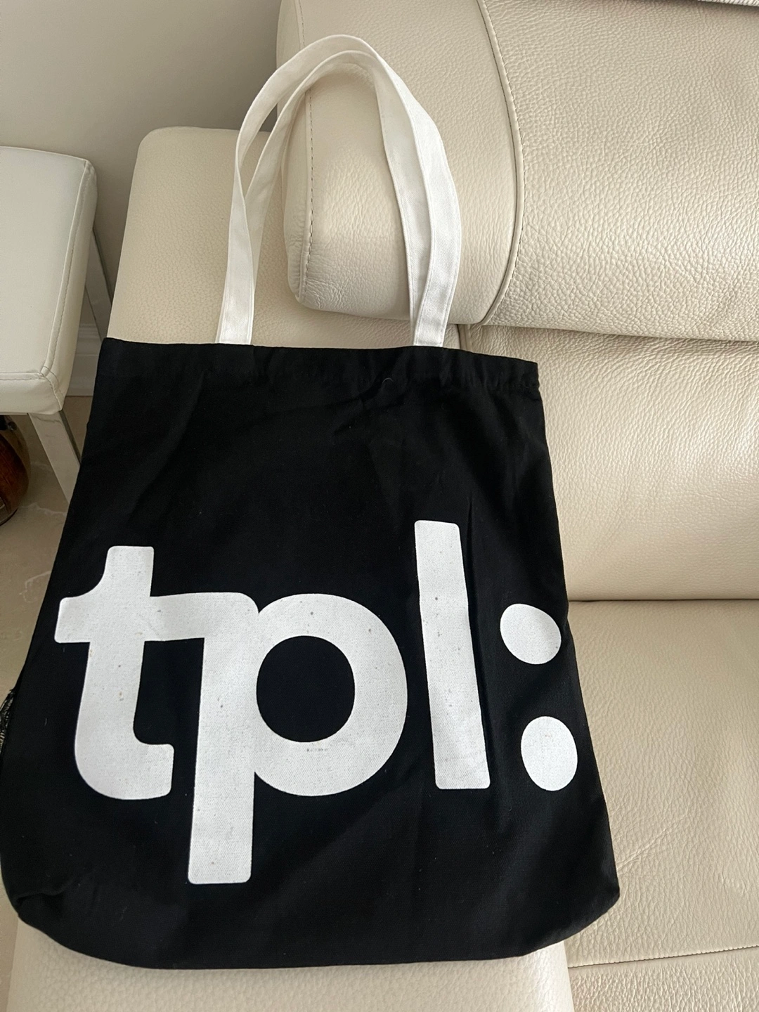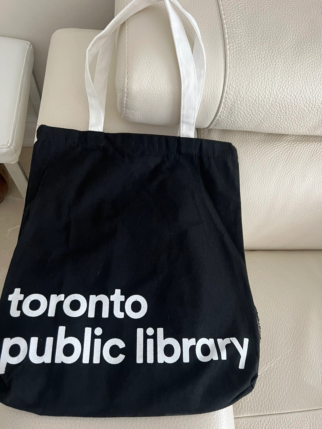 Black cotton tote bag. White Toronto Public Library logo. Reusable shopping bag. Great for books! 3 for $10.00