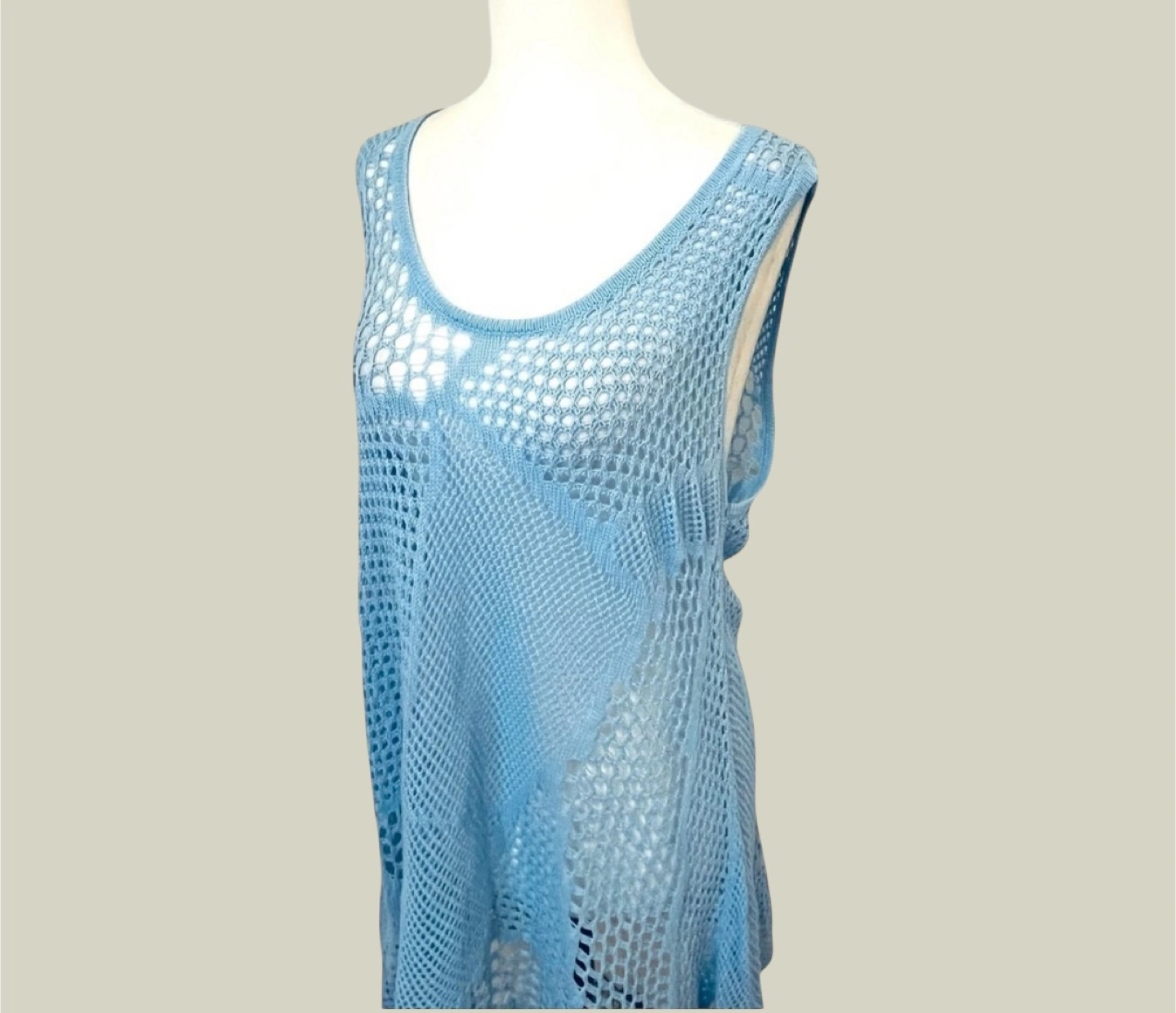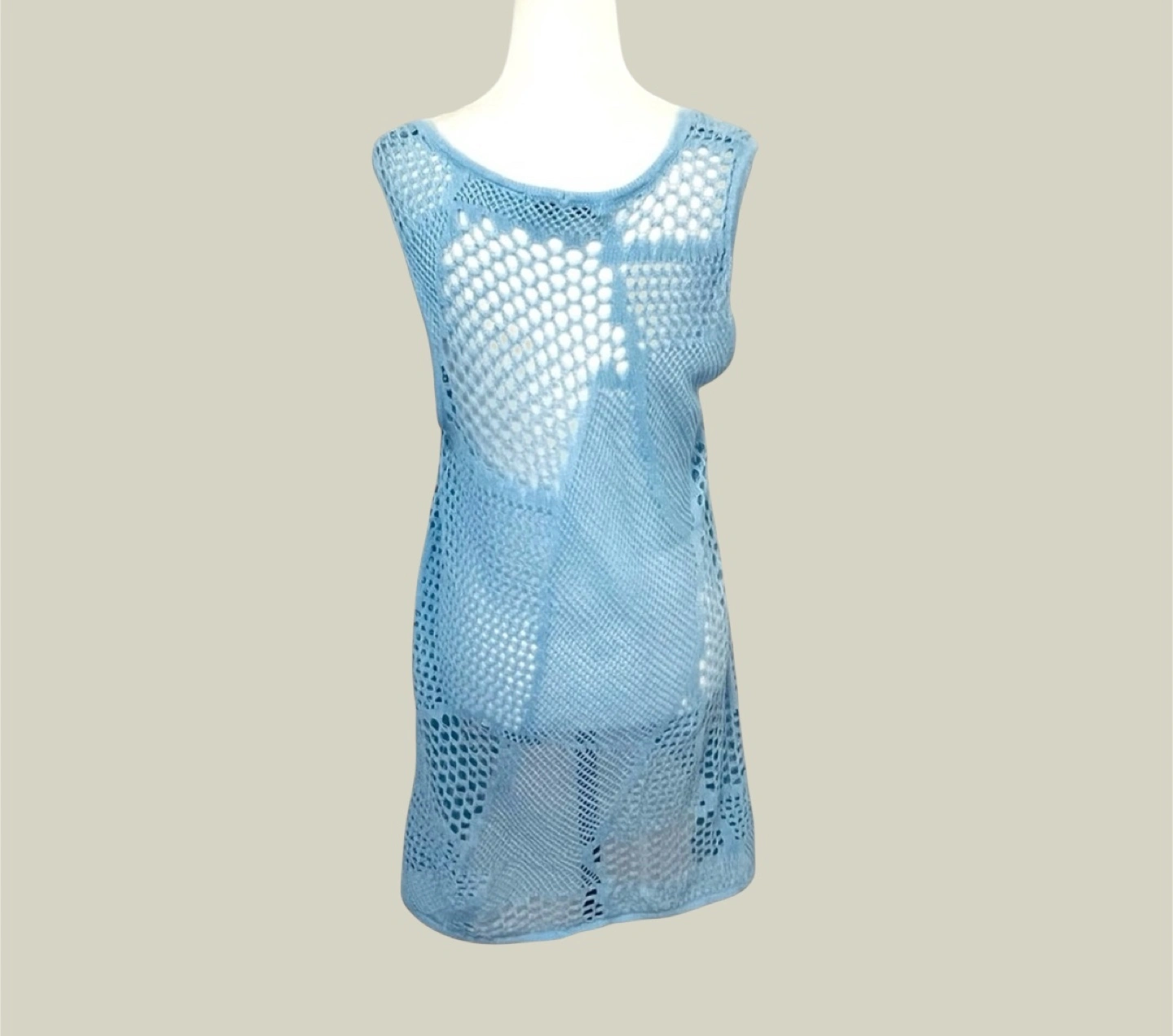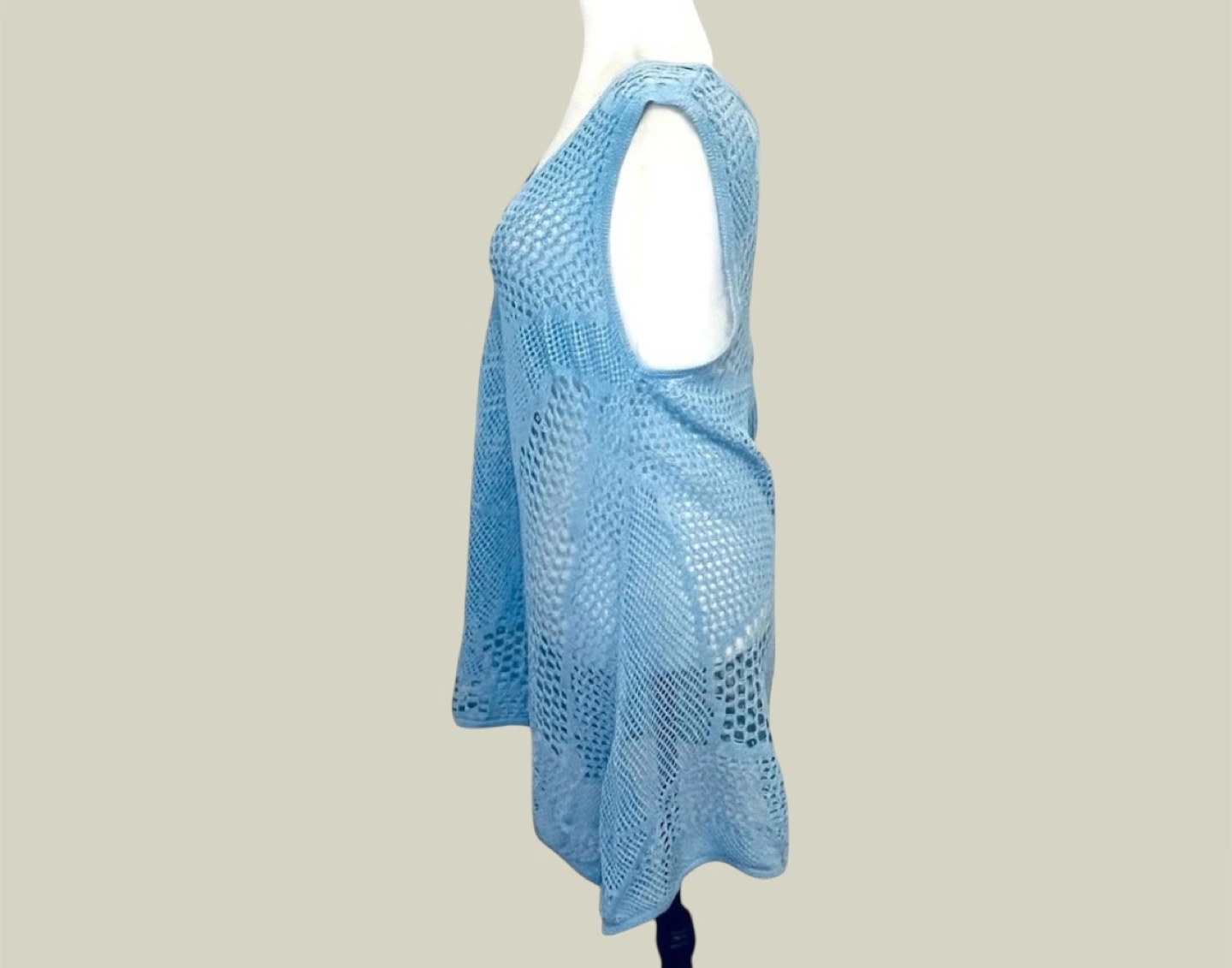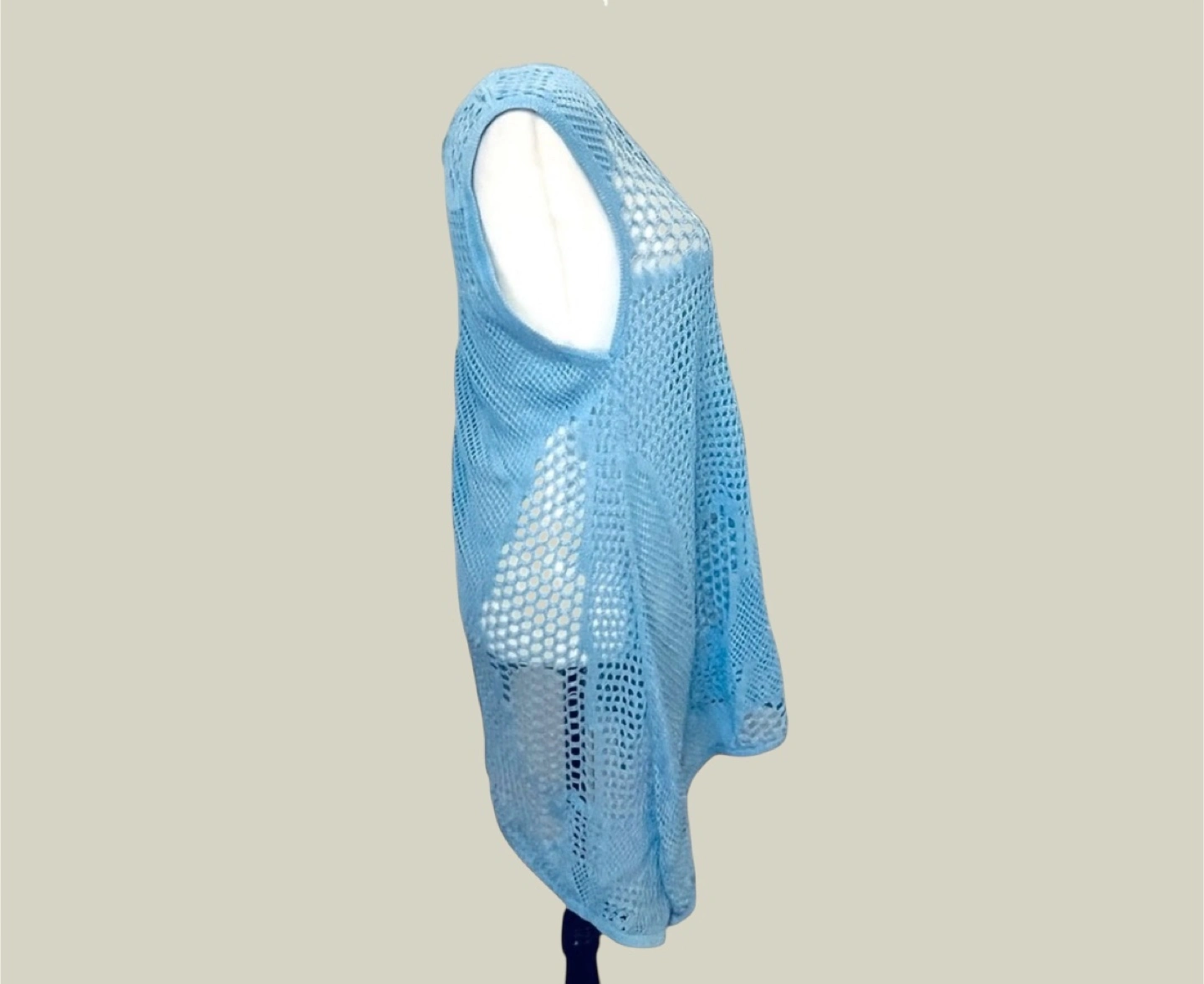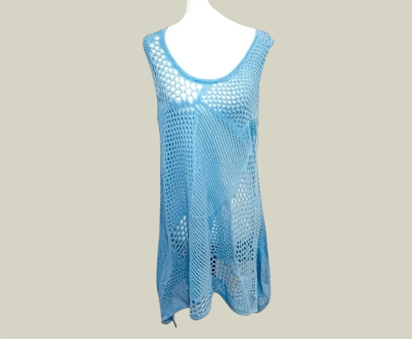 Breezy elegance defines this crochet cover-up, perfect for adding a touch of effortless style to your warm-weather wardrobe. The open-knit design offers a peek-a-boo effect, making it an ideal layering piece over your favorite swimwear. The relaxed silhouette ensures a comfortable fit, while the soft blue hue evokes a sense of calm and serenity. This versatile piece transitions seamlessly from beachside lounging to poolside cocktails or a casual resort stroll. Type: Cover Up Color: Blue Department: Women Material: Cotton, 100% Cotton Features: Crochet, Lightweight, Sheer, Breathable, Sleeveless Pattern: Solid Accents: Crochet Length 23" Pit to pit 17" PU Ottawa & Westmount, Kitchener Keywords: crochet cover up, beach cover up, swim cover up, pool cover up, resort wear, blue cover up, knit cover up, summer cover up, vacation cover up, boho cover up, festival cover up, eight eight eight, medium cover up