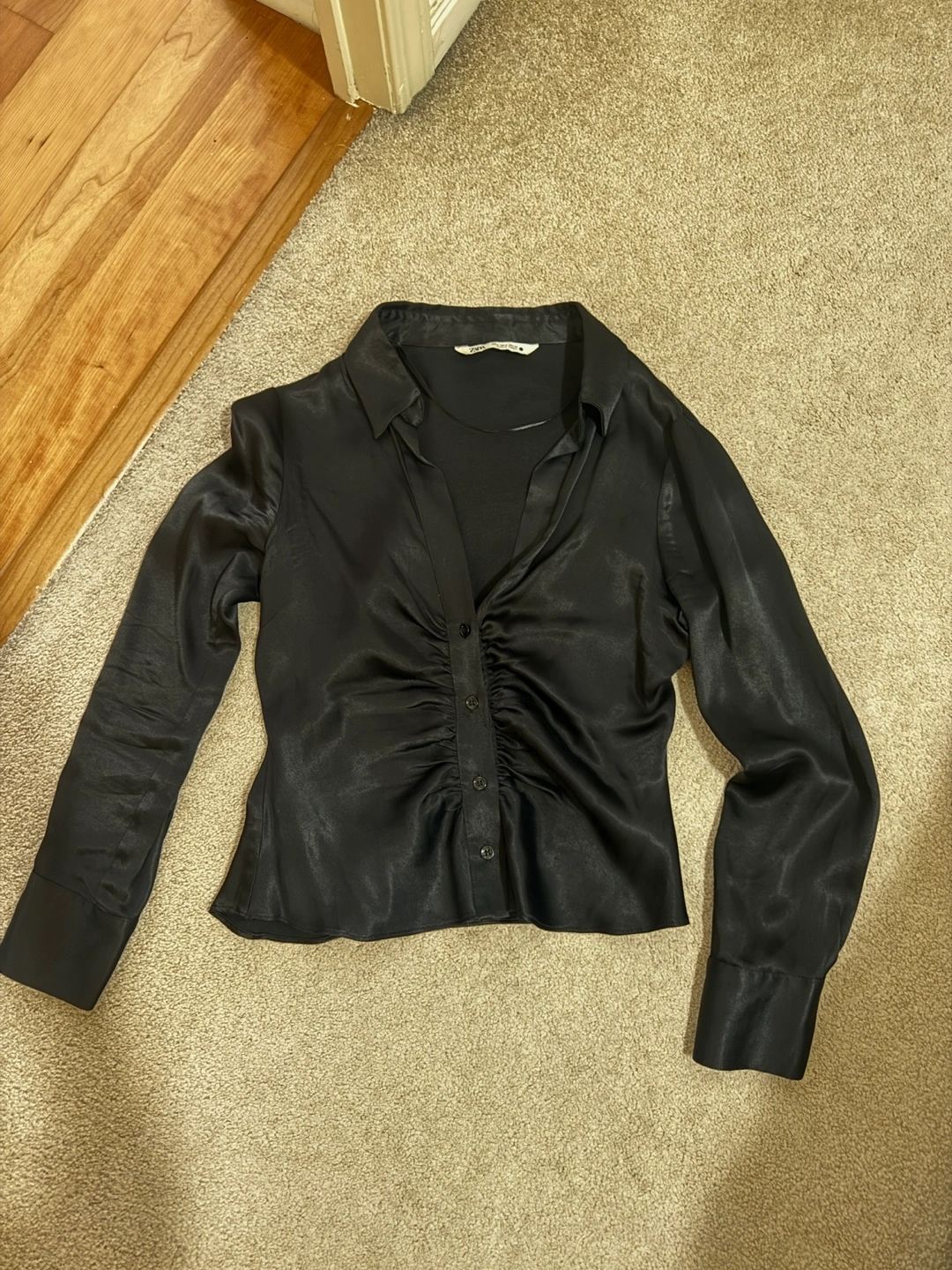 Long sleeve satin blouse. Black colour. Button-up front. Cinched waist. Size small.