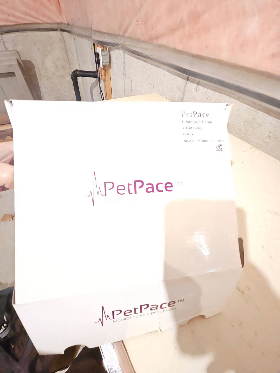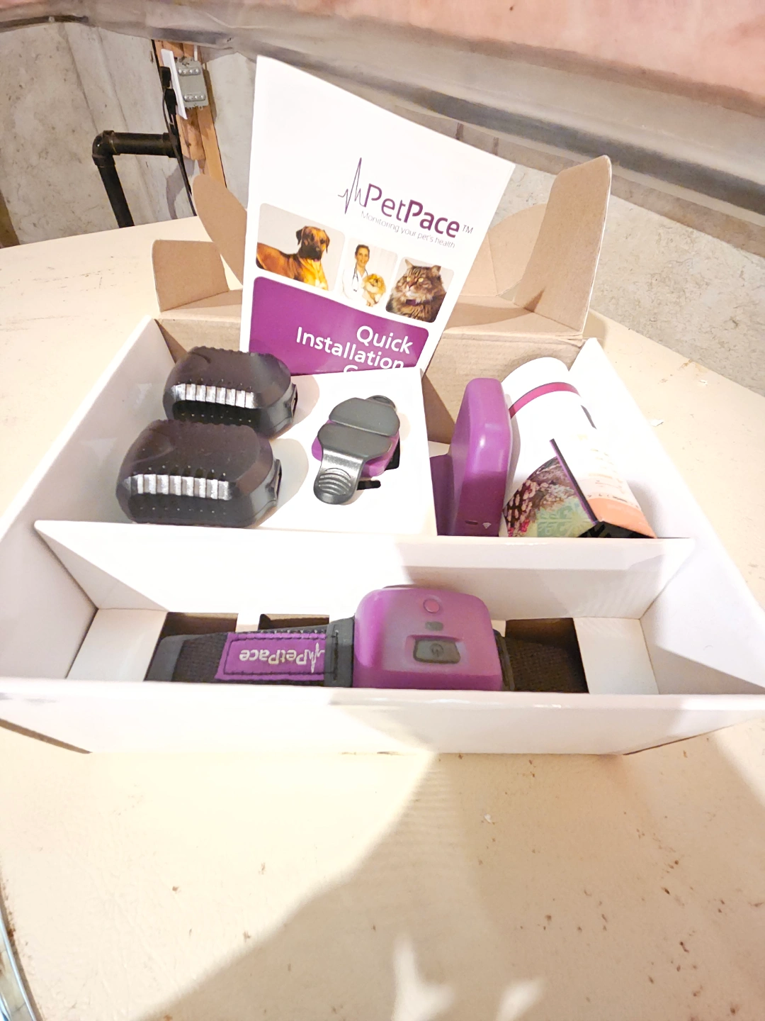 New PetPace pet monitoring system. Includes collar, gateway, and all accessories. Purple colour. Model # P-1002.