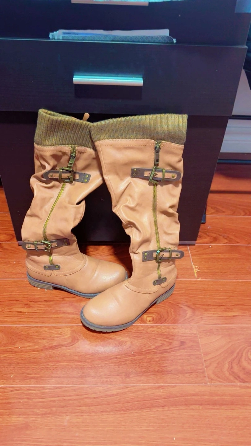 Pair of tan, faux leather, knee-high boots. Features include side zippers, buckle accents, and a folded knit cuff. Good for fall and winter.