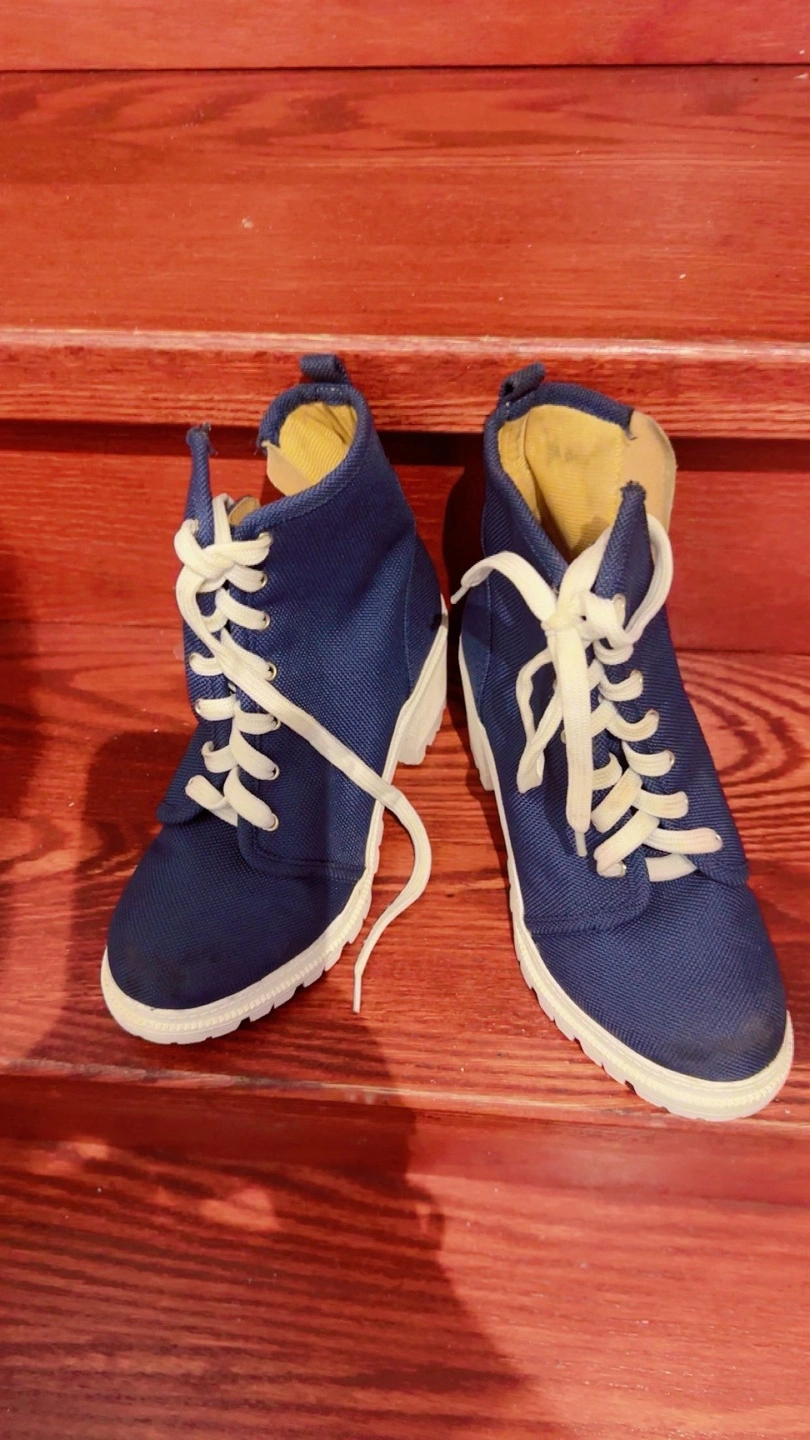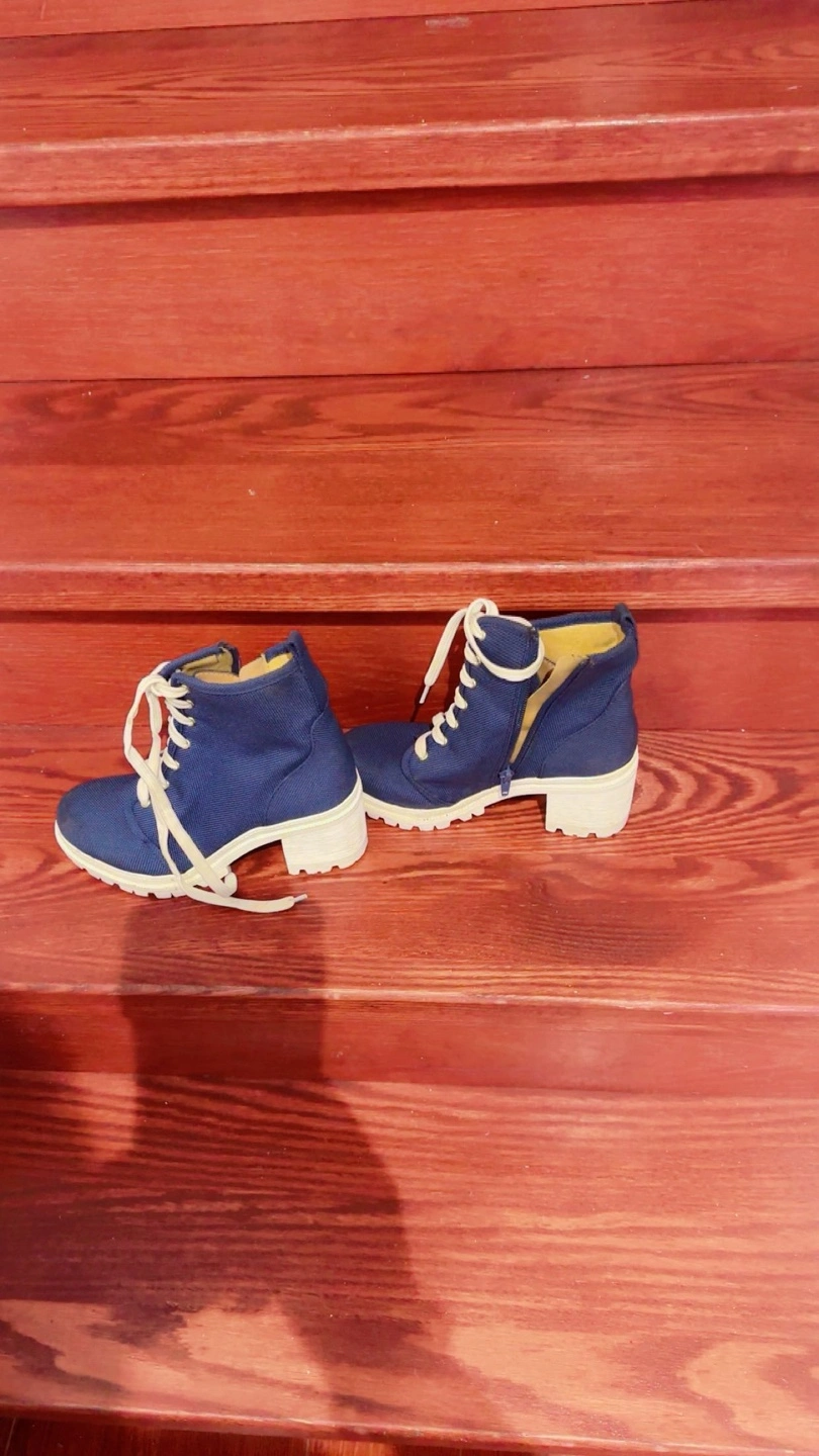 Pair of blue canvas ankle boots. Lace-up closure. Block heel. White soles and accents. Good for everyday wear.