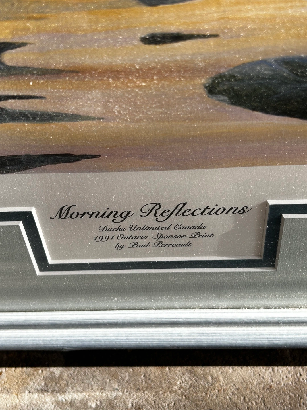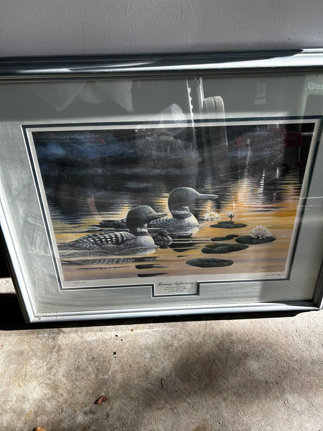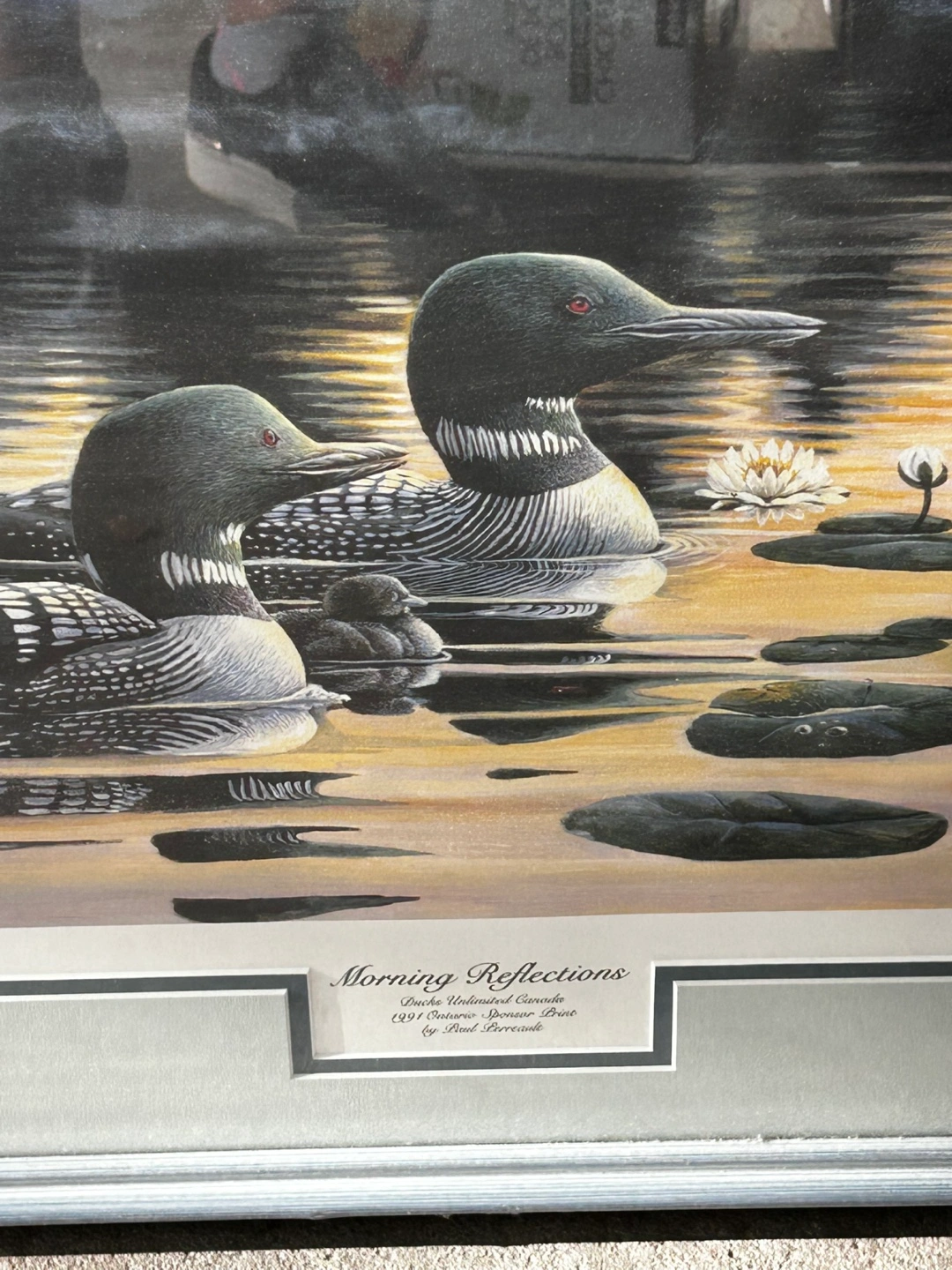 Framed print. Features two loons on a lake at sunrise. Ducks Unlimited Canada 1991 Ontario Sponsor Print. Artist signature included. Pickup area Bayview and Sheppard
