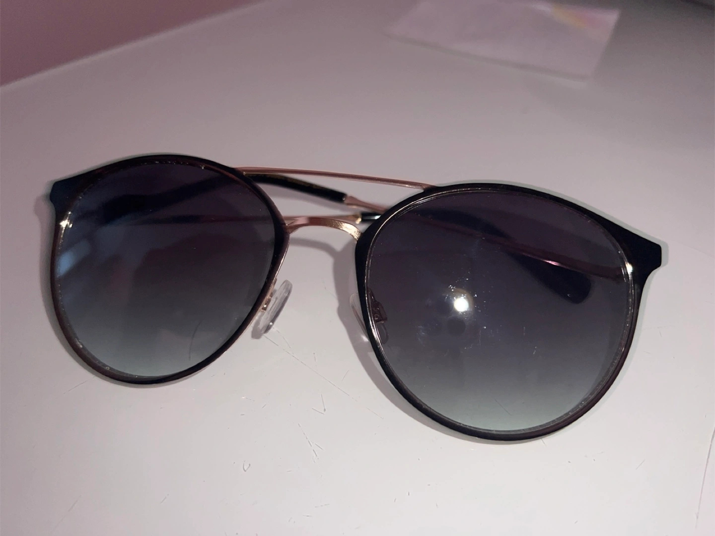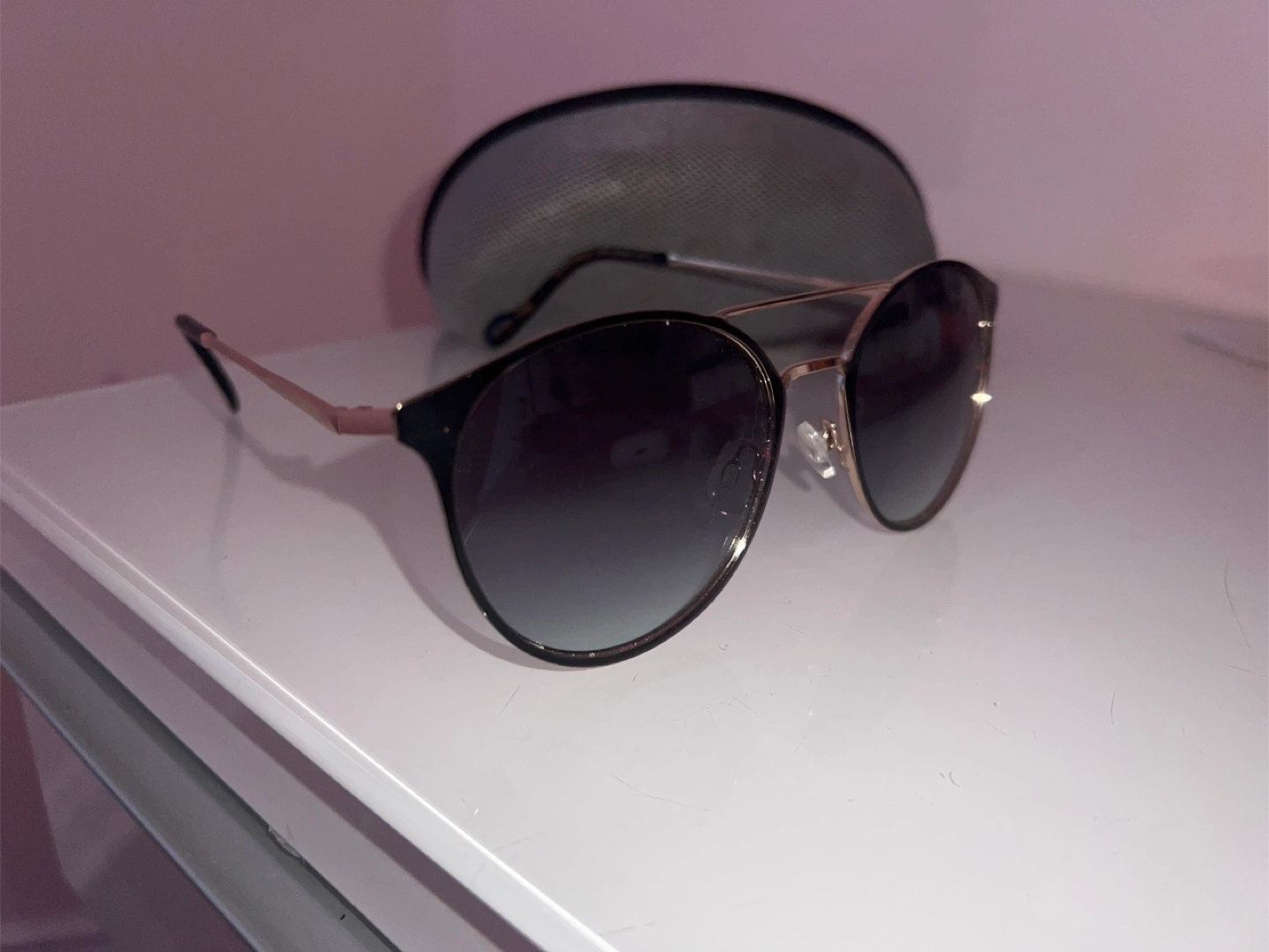 Round sunglasses, black frames with gold accents. Includes case. No damage