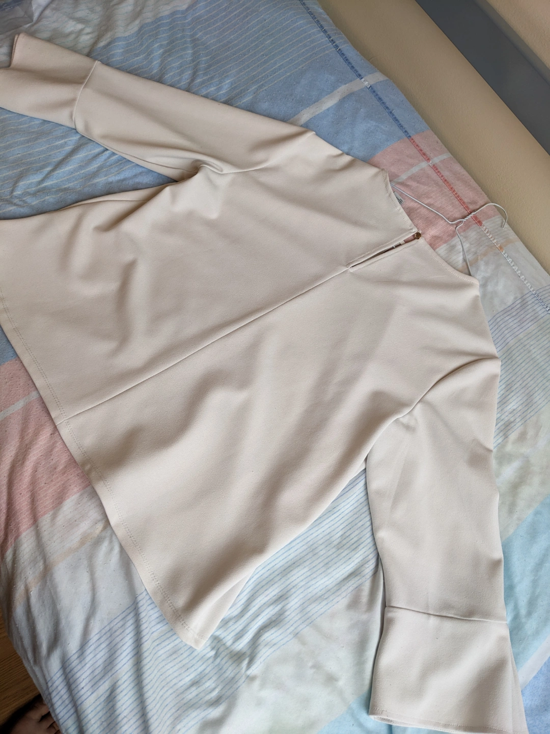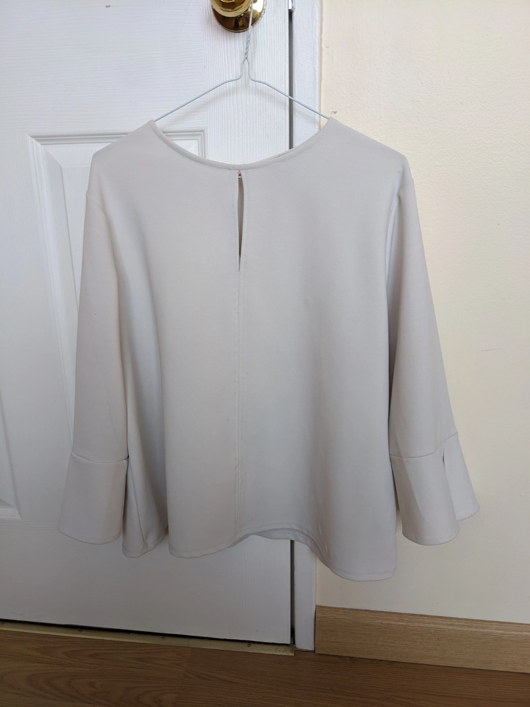 Lightweight, cream-coloured blouse. Three-quarter bell sleeves. Keyhole back detail. Relaxed fit.