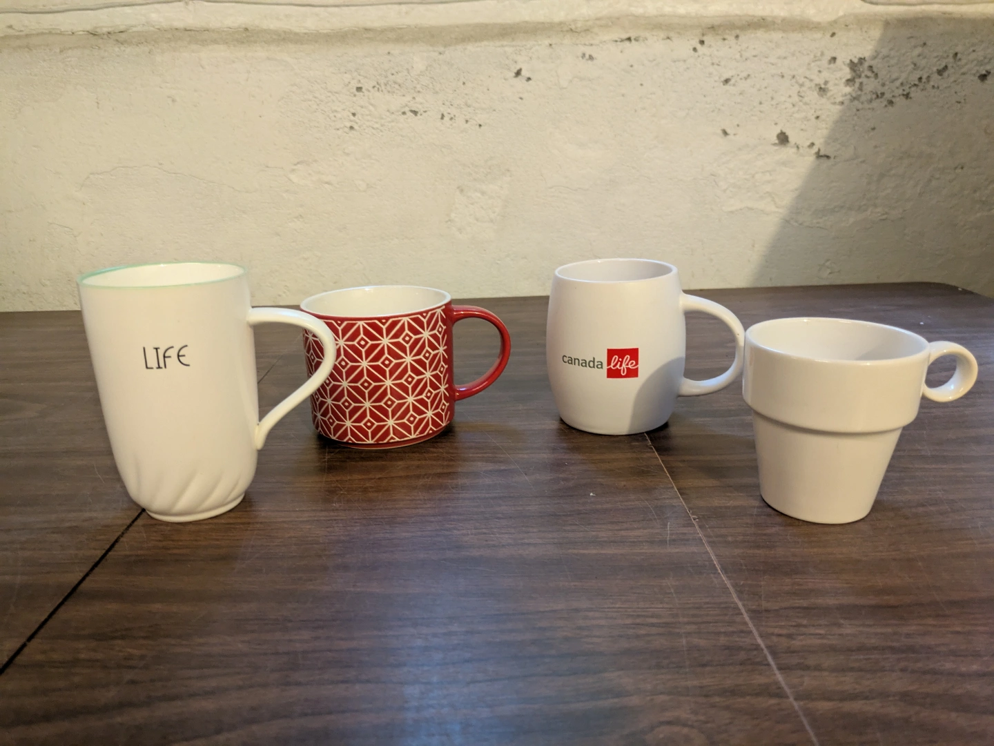 Four mugs, varying sizes and styles. One features the word "LIFE", another has a geometric design, one is branded Canada Life, and a smaller one is plain white. Excellent for coffee, tea, or hot chocolate.