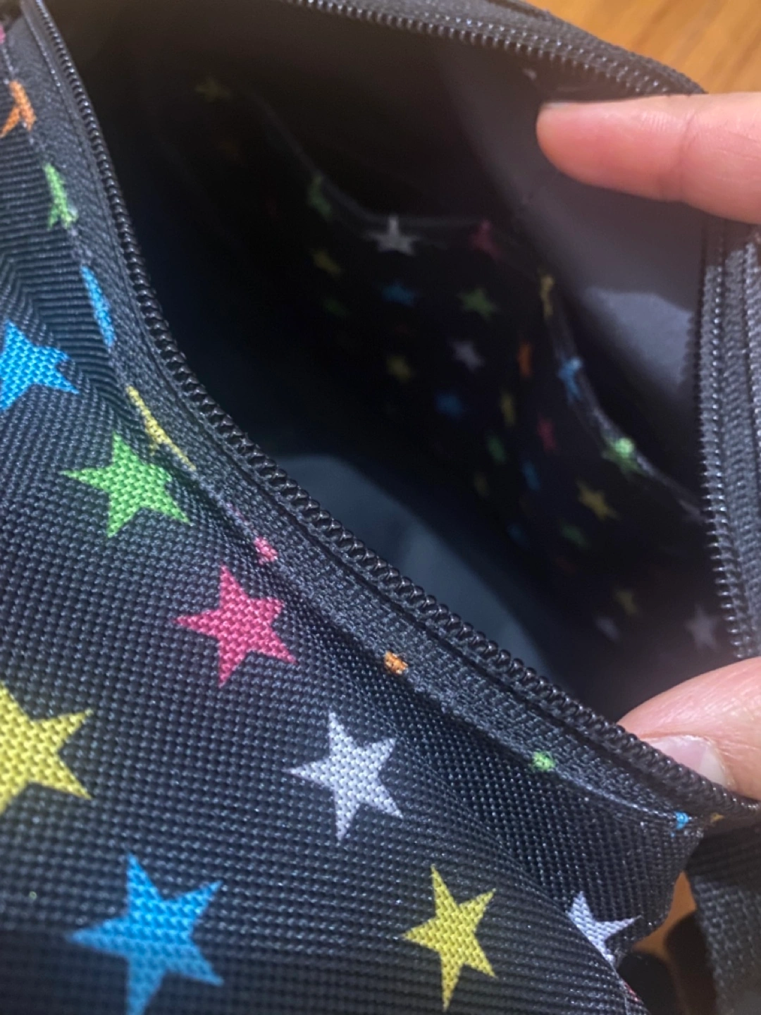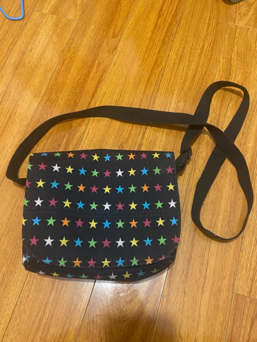 Small crossbody bag. Sturdy high quality fabric with colourful stars. Adjustable strap. Zipper closure with velcro. Interior pocket. Cute for both kids and adults. Velcro has a little bit of dust attached to it, but otherwise it’s a sturdy bag made to last. I’ve had it for over 10 years now.