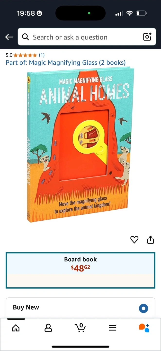 24-page interactive board book for ages 6-8. Features a magnifying glass. Explores animal homes. Sturdy oversized pages, movable elements, bold graphic illustrations. Part of the Magic Magnifying Glass series. Brand new