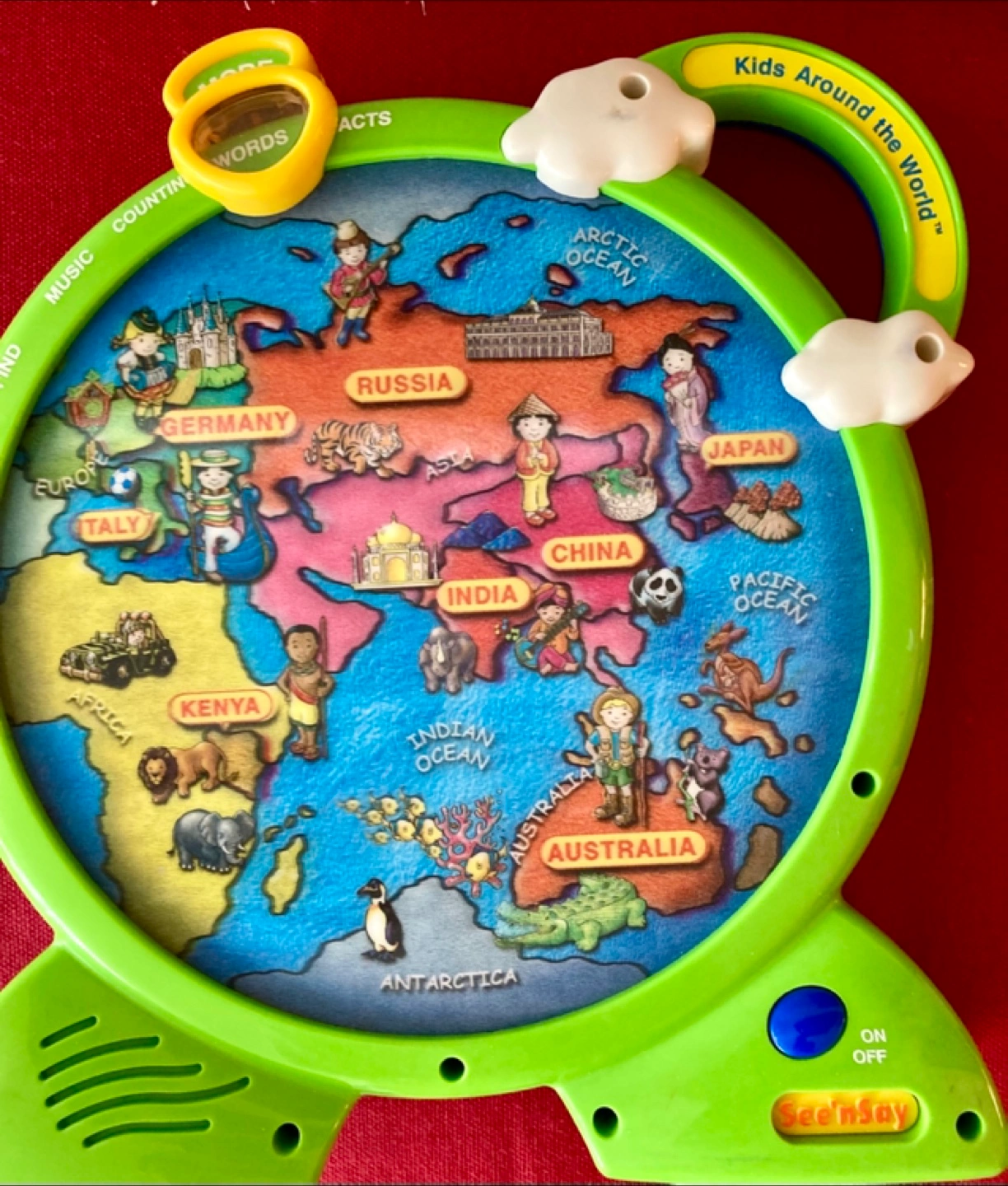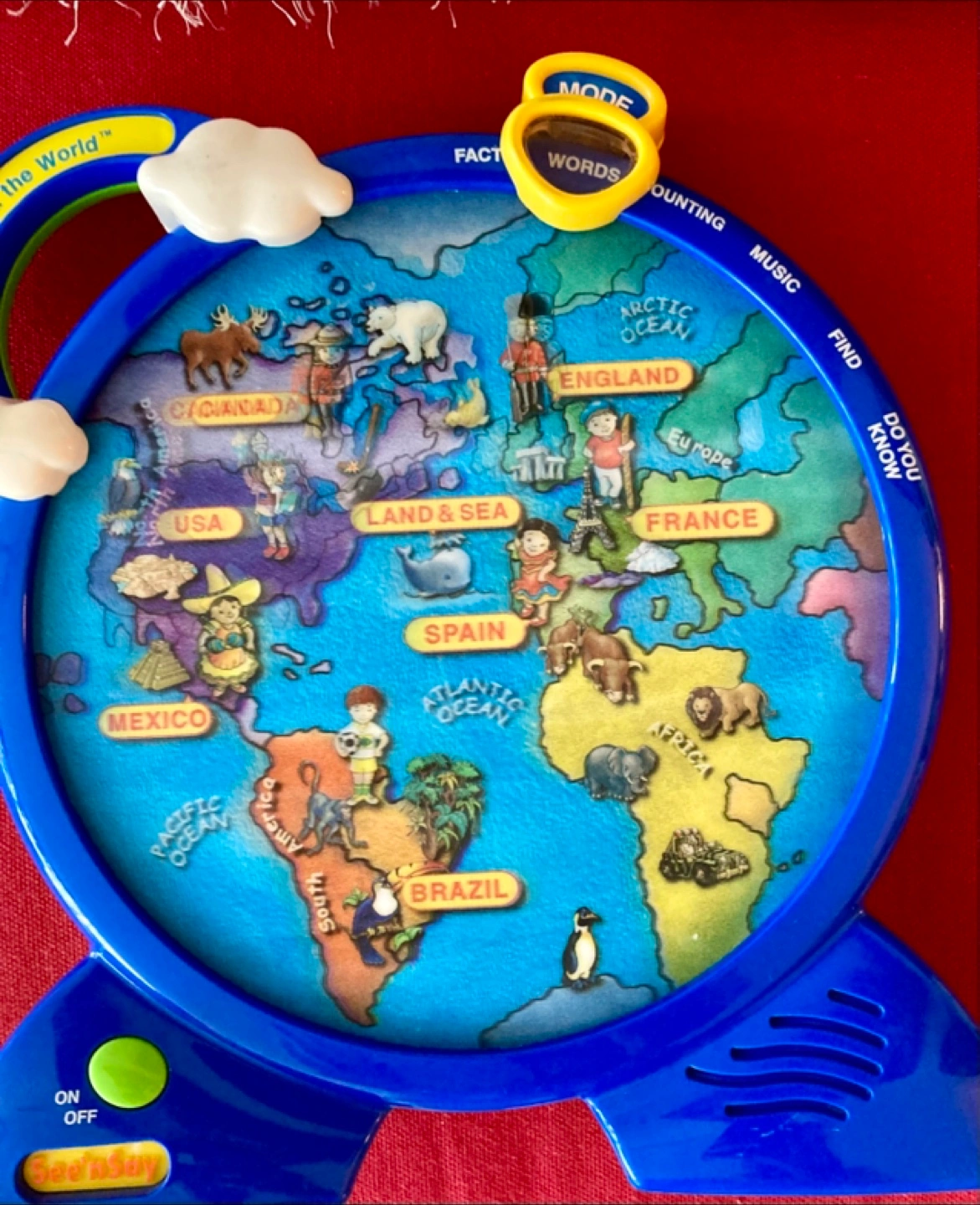 Educational toy. Features a world map. Multiple modes: music, counting, words, facts. Learn about different countries and continents. Great for children.