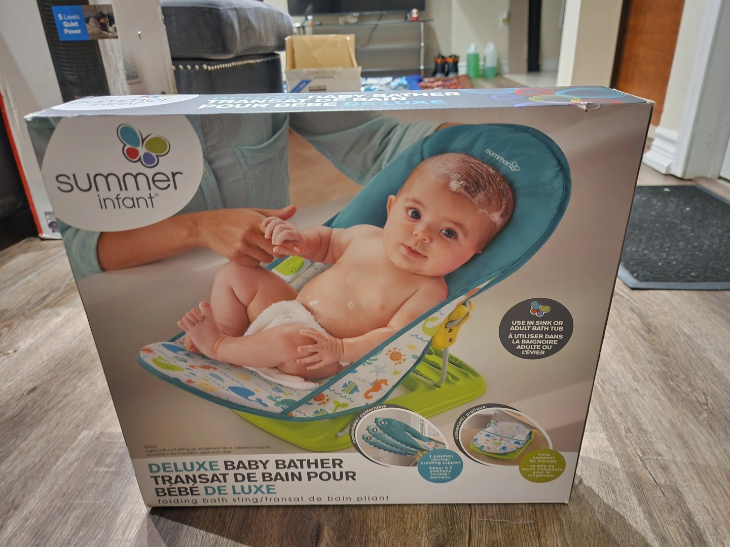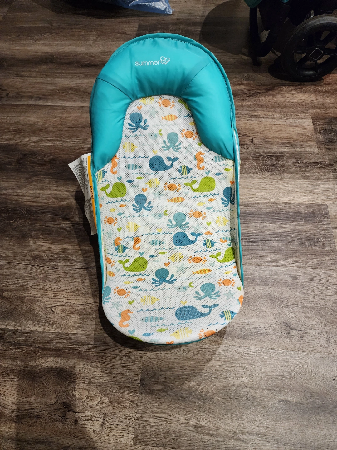Infant bath seat. Teal and white ocean theme. Use in sink or tub. Folds for easy storage.