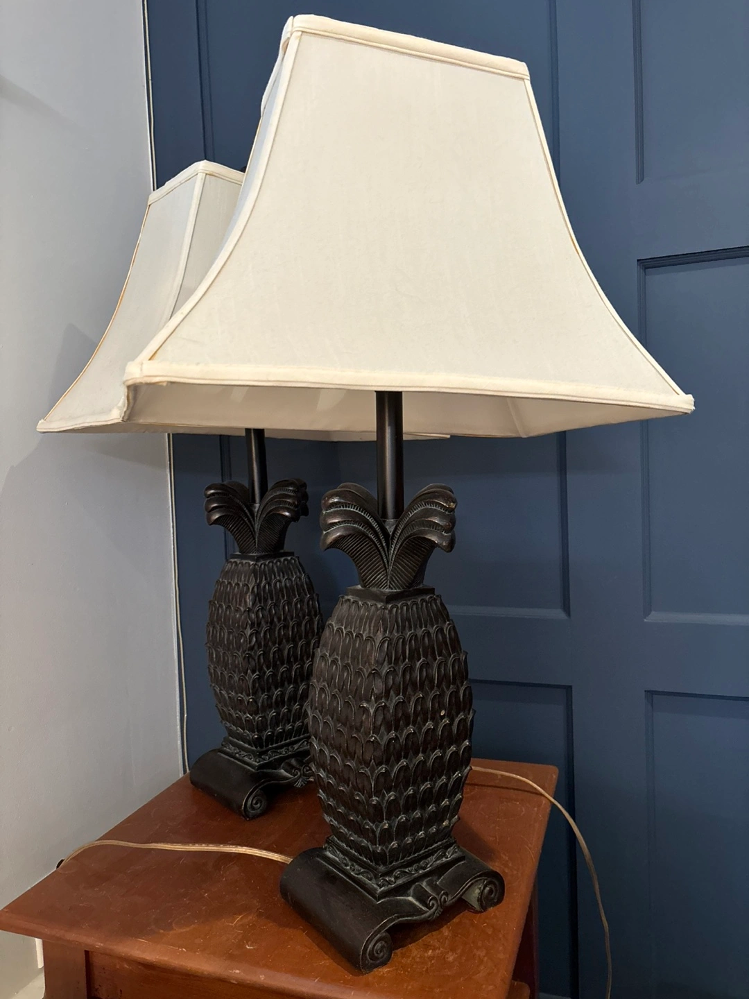 Two dark brown pineapple-shaped table lamps. The lamps have a 50 100 150 switch