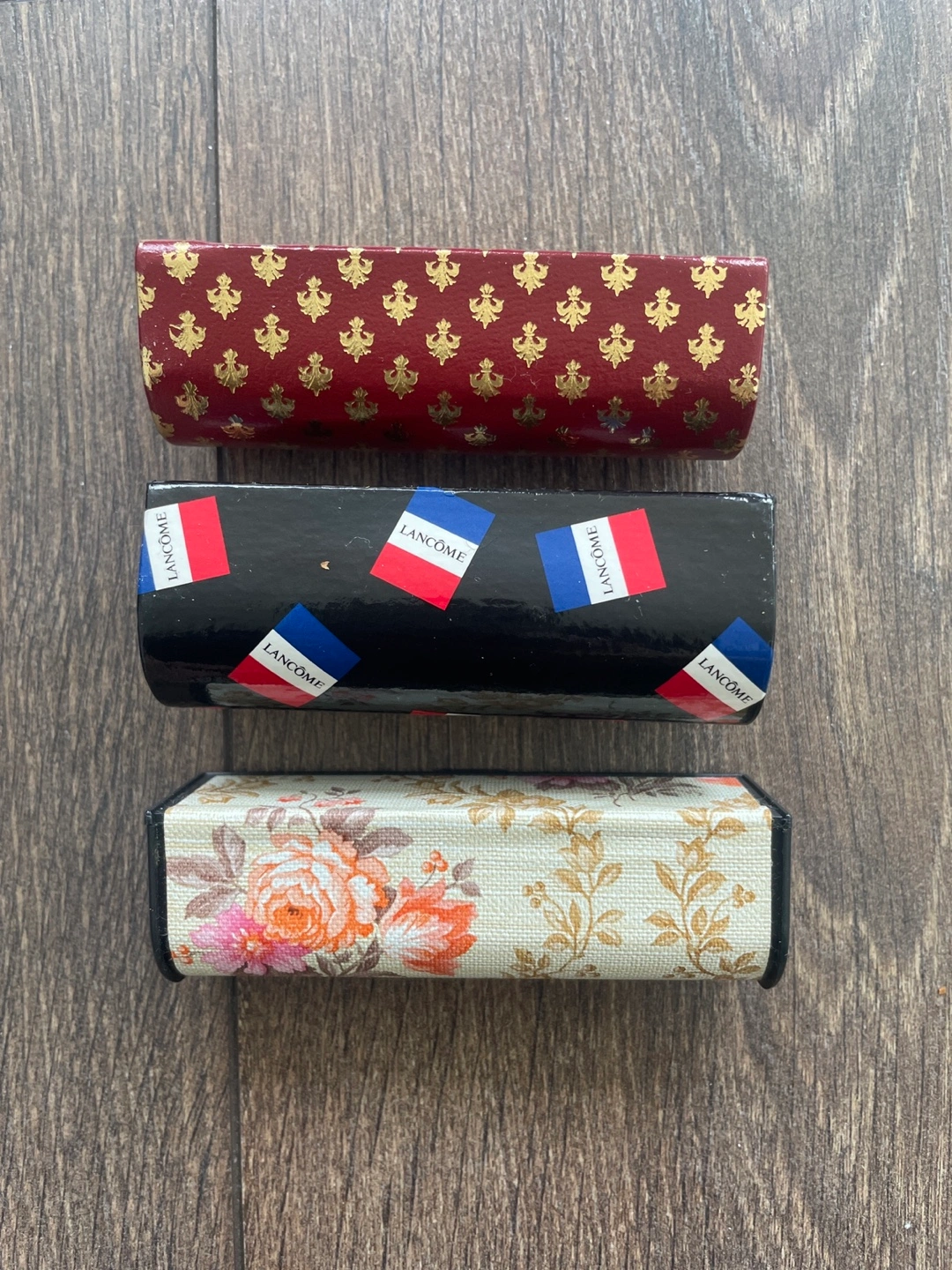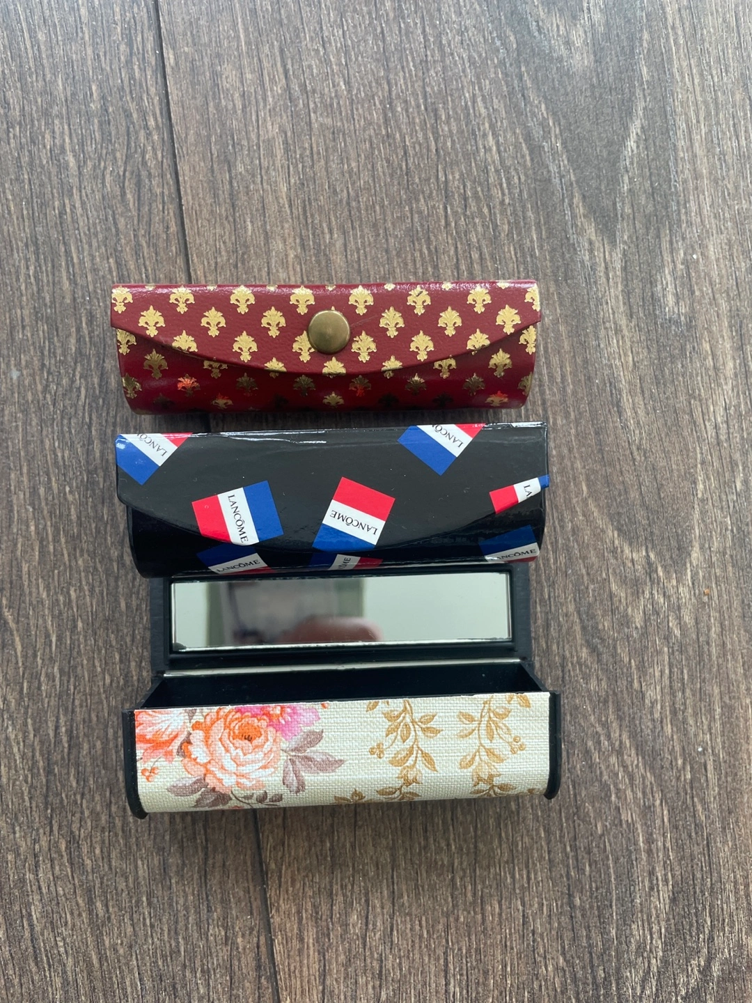 Set of three vintage Lancôme lipstick cases with small mirror inside. Each case features a unique design. Red patterned case, black and white French flag case, and floral patterned case. Great for collectors or lipstick lovers.