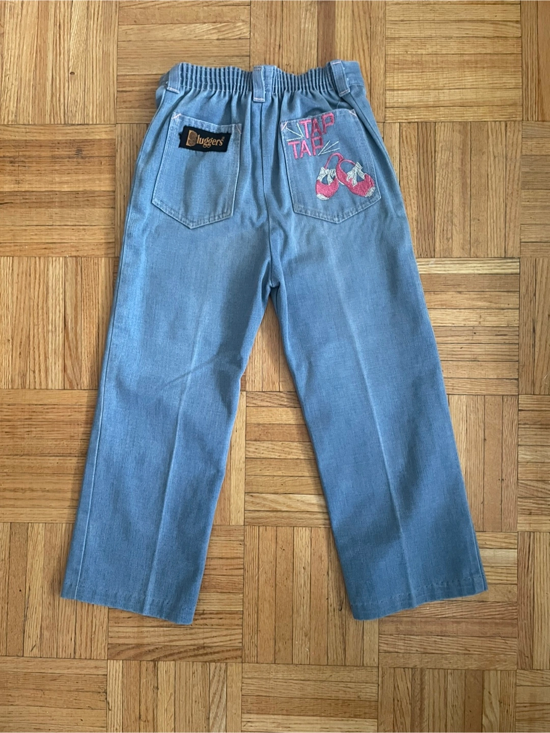 Pair of light blue denim jeans with embroidered tap shoes Door pickup only. From a smoke-free, pet-free, and pest-free home.