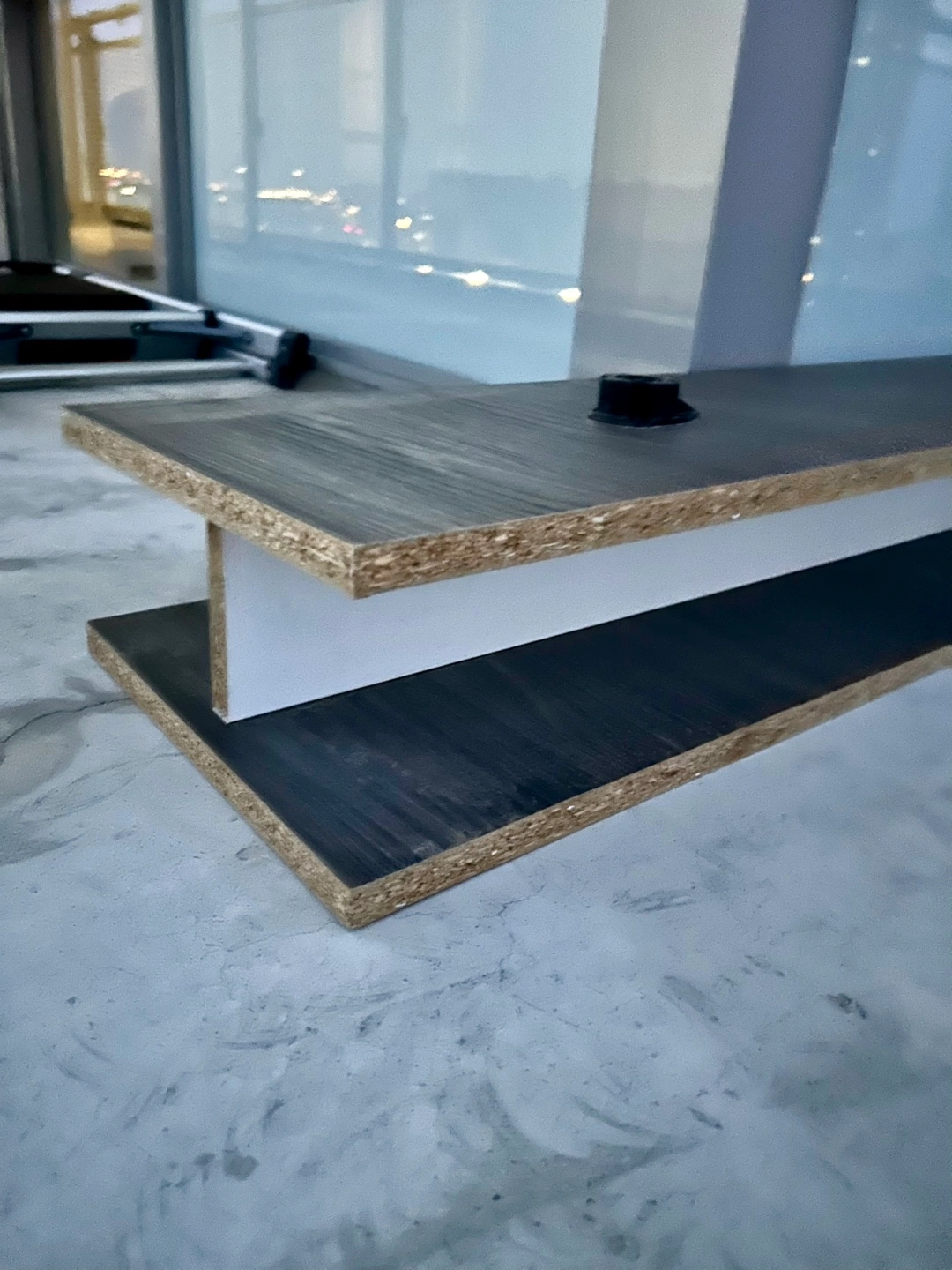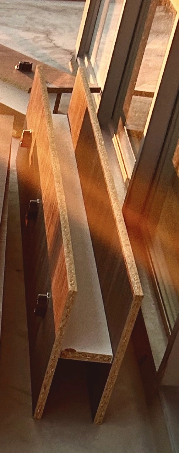 Set of melamine boards. Brown melamine finish. Multiple shelves included. Hardware for assembly. Great for DIY projects.