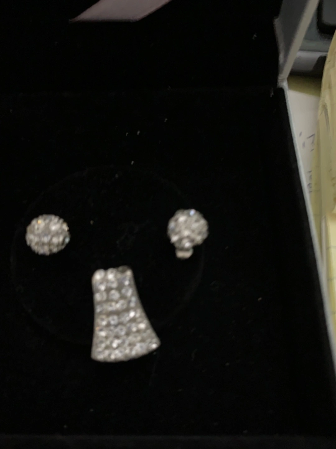 Stunning three-piece jewellery set. Features two small stud earrings and a statement pendant. All pieces are encrusted with sparkling crystals.