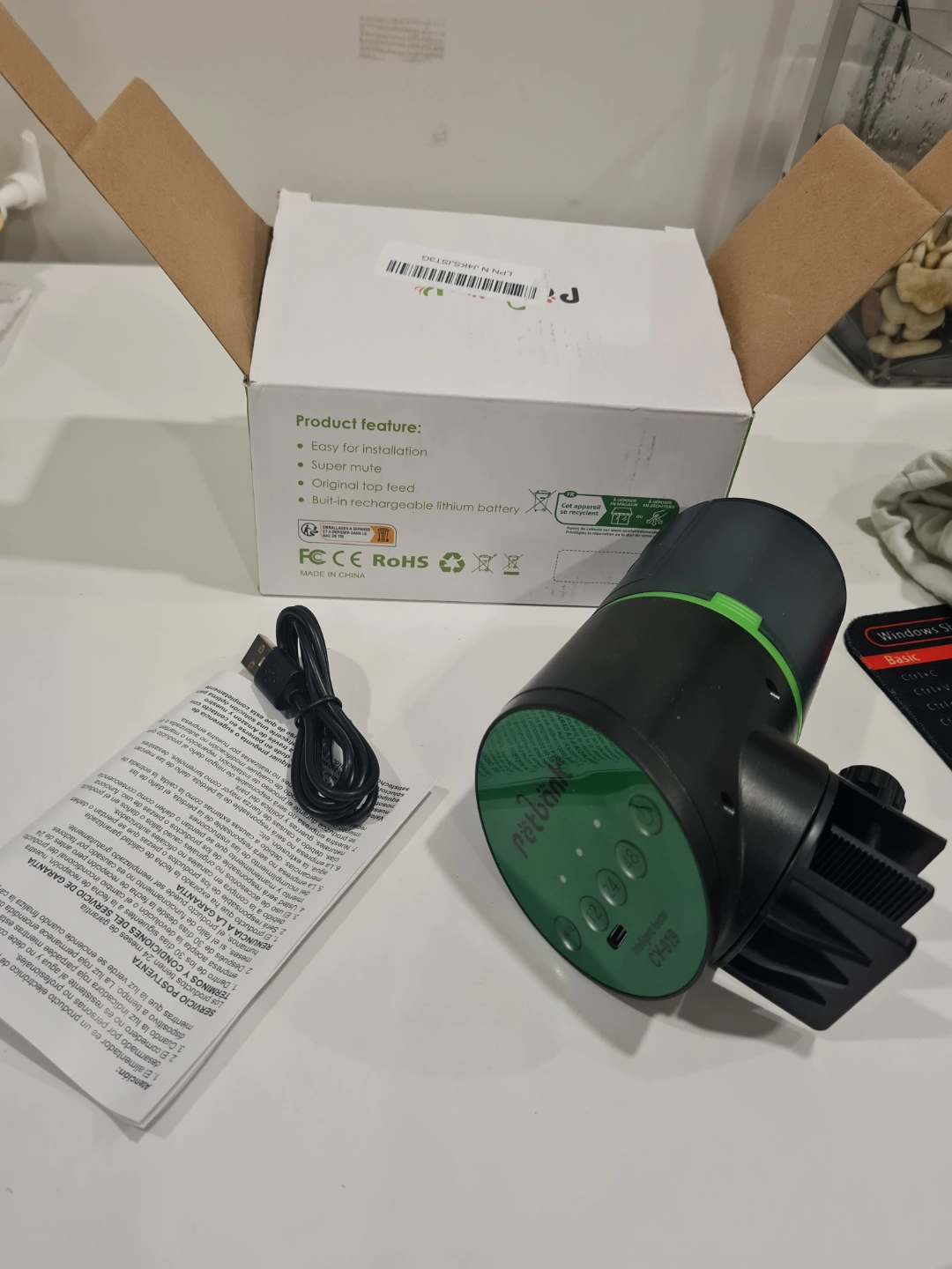 Automatic pet feeder. Model CY-019. Easy to install. Super mute. Original top feed. Built-in rechargeable lithium battery. Includes USB charging cable and manual.