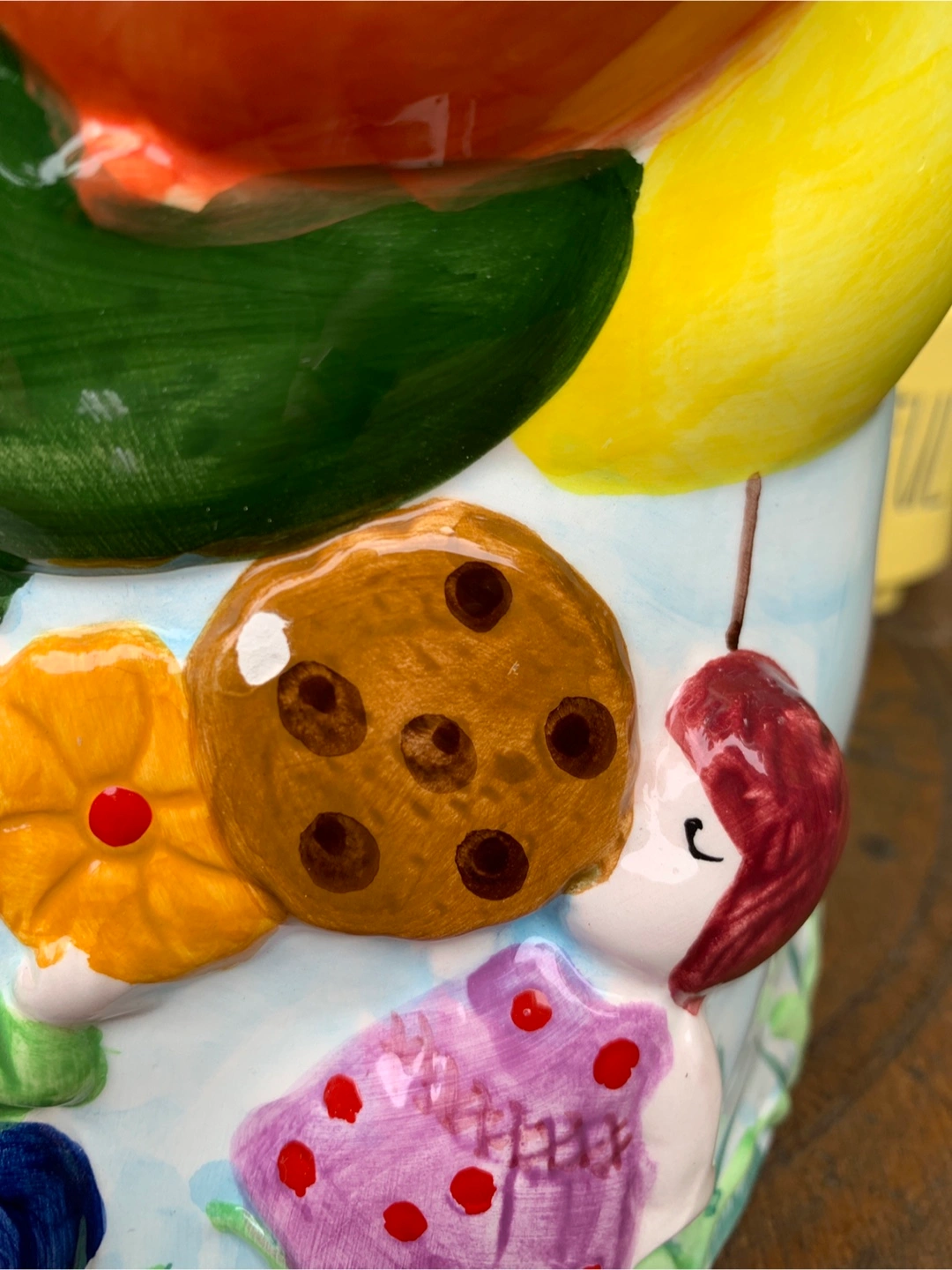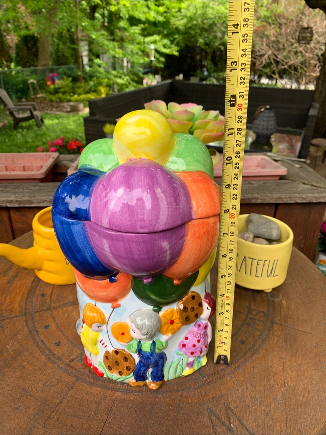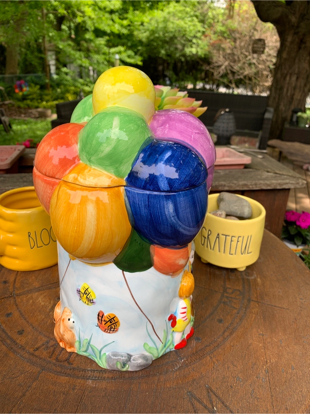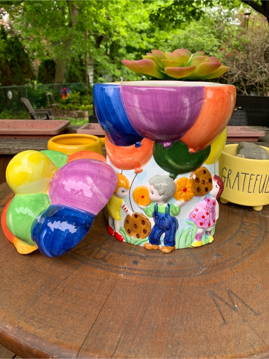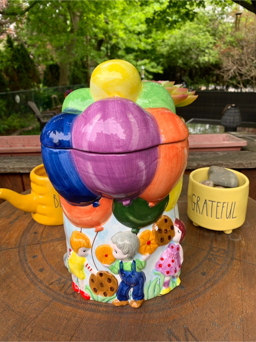 ON SALE FOR 50% OFF! Adorable vintage cookie jar featuring colourful hot air balloons and children. Ceramic construction. Super cute design with the balloon lid and 3-dimensional children scene on the bottom. One small flea bite on the cookie but otherwise in perfect condition. Great for storing cookies, other treats or as a nostalgic decor piece on a counter in the kitchen. Props not included. Cash only please.