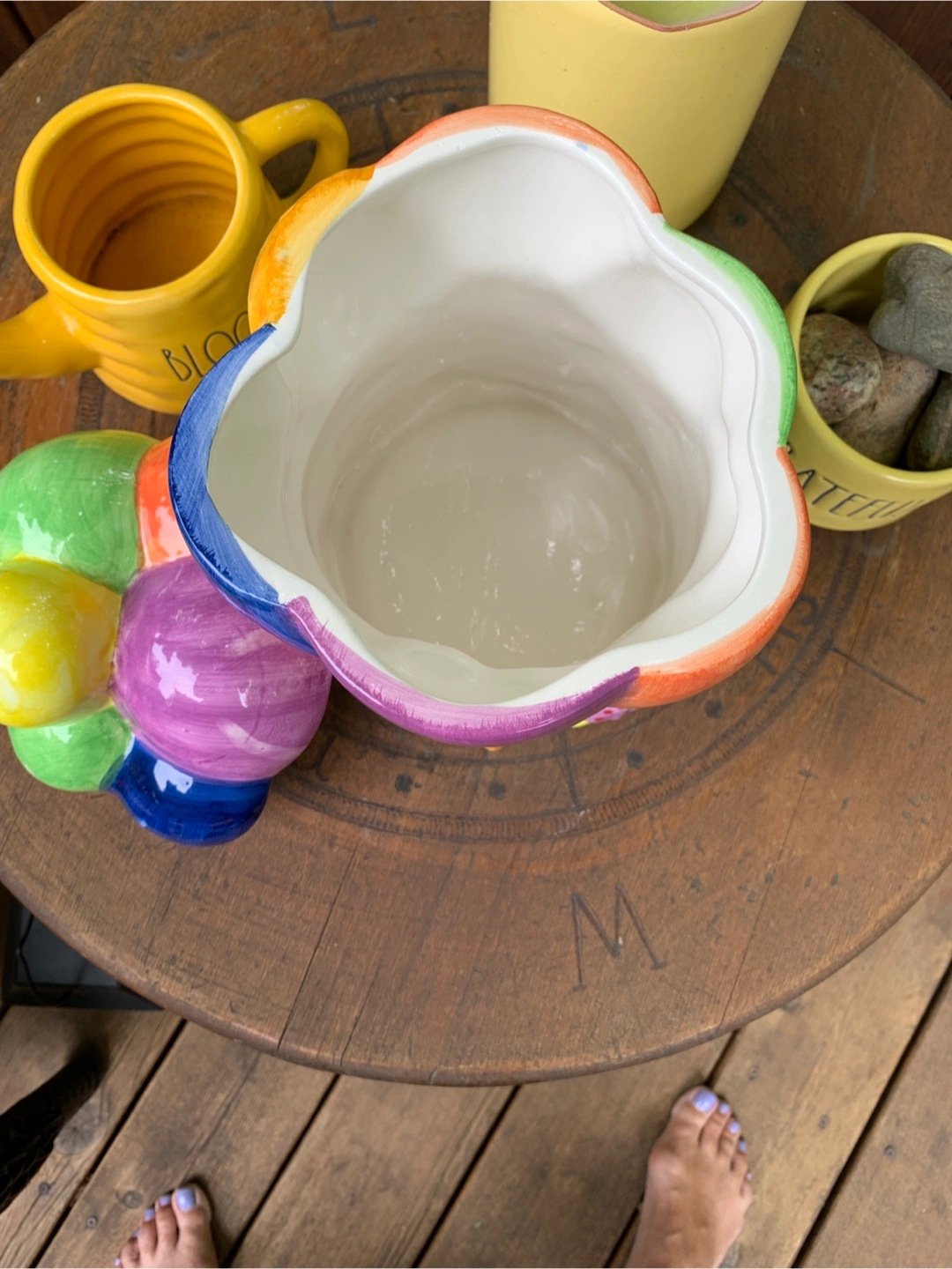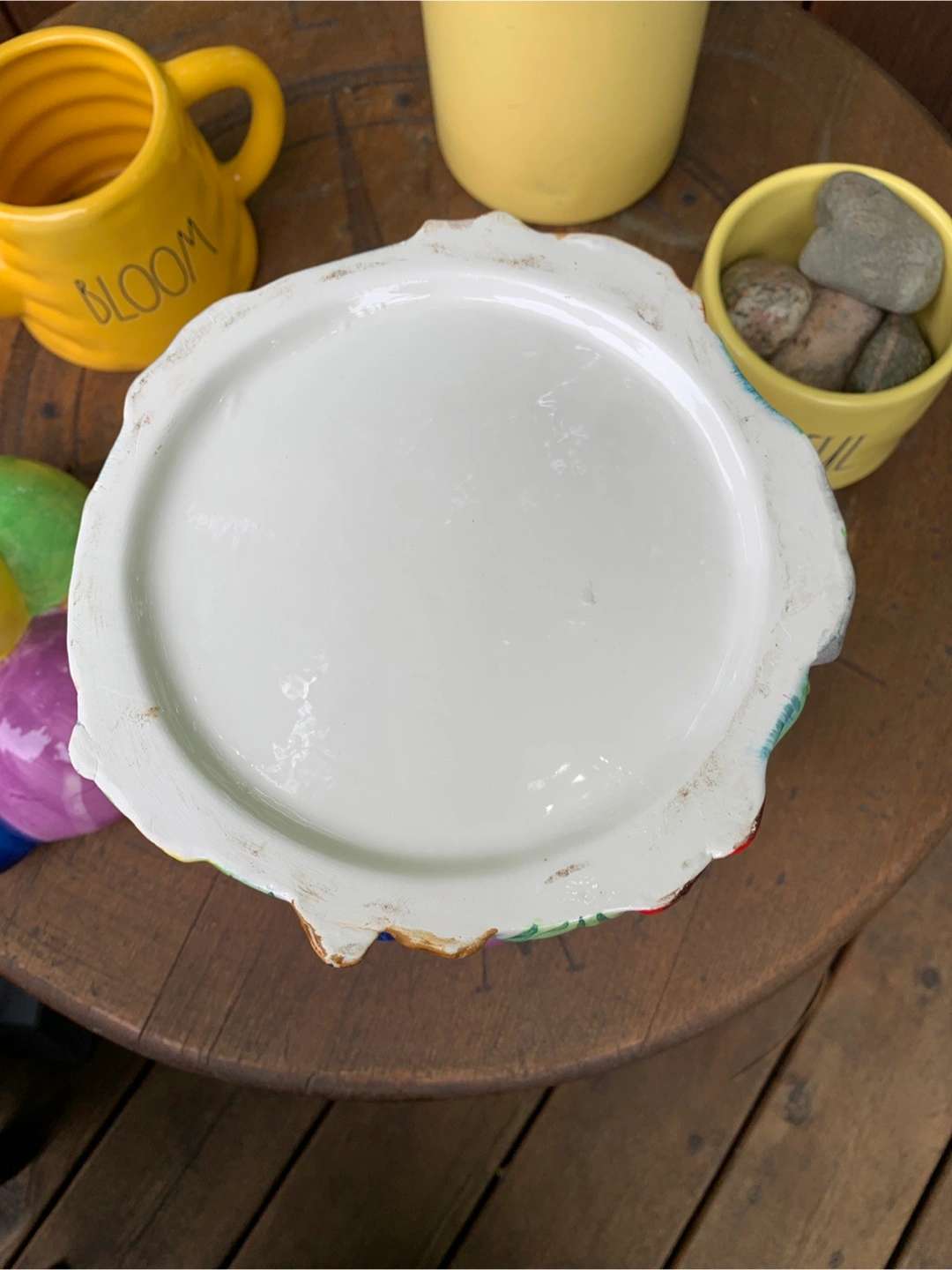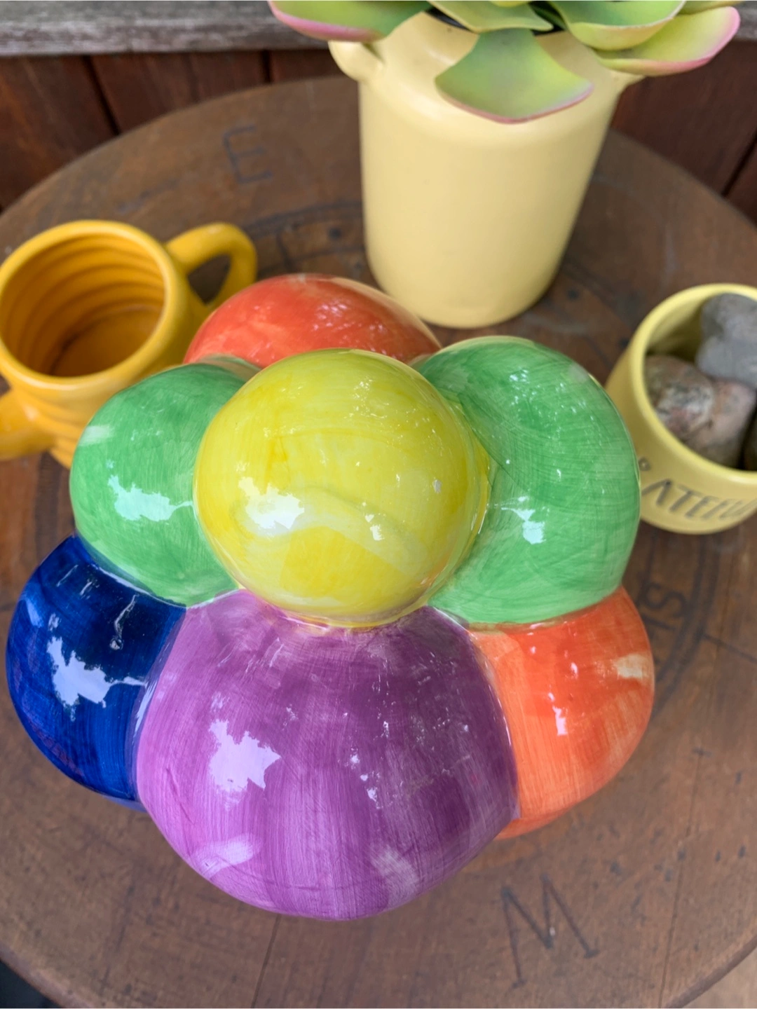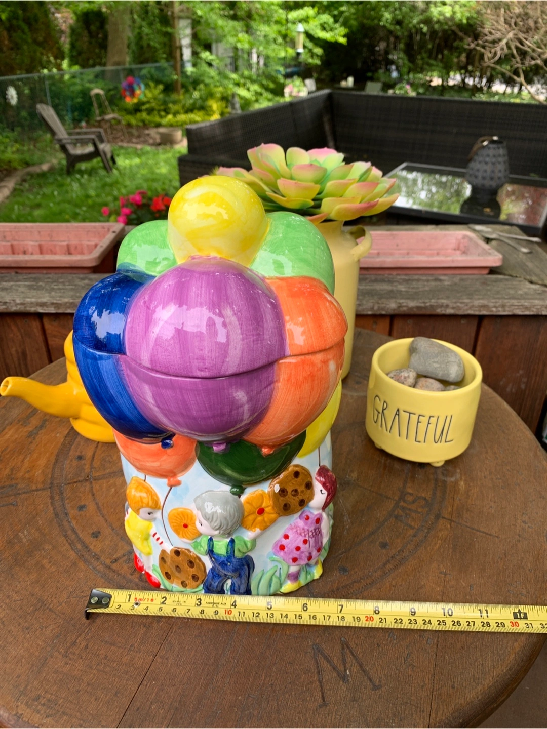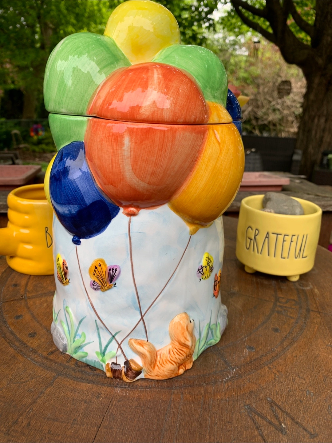 ON SALE FOR 50% OFF! Adorable vintage cookie jar featuring colourful hot air balloons and children. Ceramic construction. Super cute design with the balloon lid and 3-dimensional children scene on the bottom. One small flea bite on the cookie but otherwise in perfect condition. Great for storing cookies, other treats or as a nostalgic decor piece on a counter in the kitchen. Props not included. Cash only please.